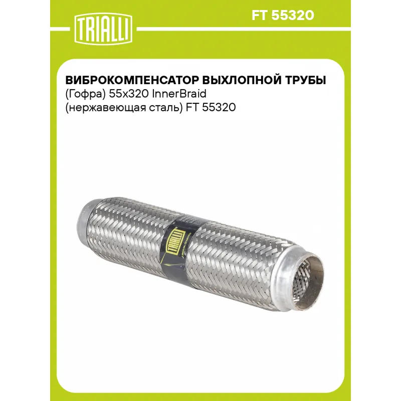 Виброкомпенсатор выхлопной трубы (Гофра) 55x320 InnerBraid (нержавеющая сталь) Характеристики: Артикул: FT 55320 OEM номера: 55-320, 55x320 Гарантийный срок: 2 года/60 тыс. Количество на автомобиль: 1 Тип конструкции: InnerBraid Особенности конструкции:: Трёхслойная Размер ID/NL, мм: 55/320 Под трубу диаметром, мм: 54-55 Длина изделия (мм): 320 Материал: Нержавеющая сталь марки AISI 201 Товарная линейка: BLACK Дополнительная информация: Этикетка изделия может отличаться от представленной на фото Комплектация: Виброкомпенсатор выхлопной трубы - 1 шт Гарантия: от 1 года.