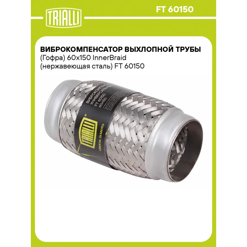 Виброкомпенсатор выхлопной трубы (Гофра) 60x150 InnerBraid (нержавеющая сталь) Характеристики: Артикул: FT 60150 OEM номера: 60x150 InnerBraid, 60x150, 60150, 60х150 Гарантийный срок: 2 года/60 тыс. Количество на автомобиль: 1 Тип конструкции: InnerBraid Особенности конструкции:: Трёхслойная Размер ID/NL, мм: 60/150 Под трубу диаметром, мм: 59-60,3 Длина изделия (мм): 150 Материал: Нержавеющая сталь марки AISI 201 Товарная линейка: BLACK Дополнительная информация: Этикетка изделия может отличаться от представленной на фото Комплектация: Виброкомпенсатор выхлопной трубы - 1 шт Гарантия: от 1 года.