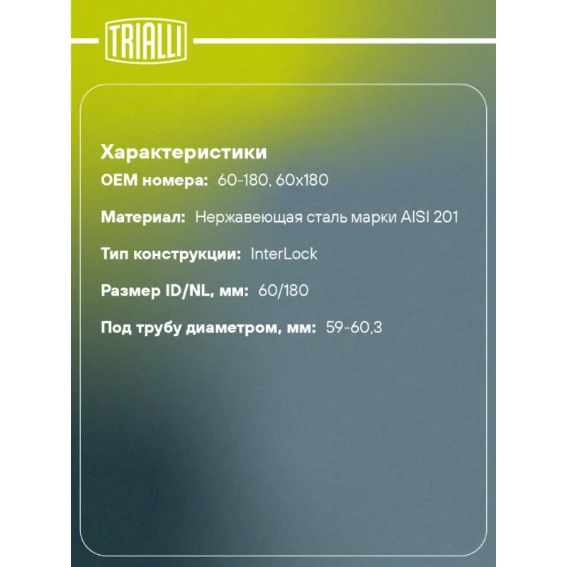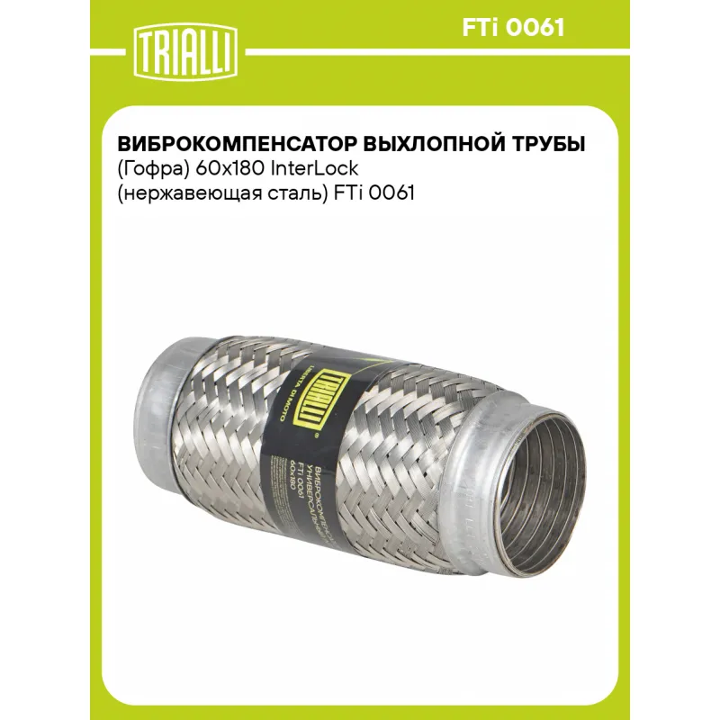 Виброкомпенсатор выхлопной трубы (Гофра) 60x180 InterLock (нержавеющая сталь) Характеристики: Артикул: FTi 0061 OEM номера: 60-180, 60x180 Гарантийный срок: 2 года/60 тыс. Количество на автомобиль: 1 Тип конструкции: InterLock Особенности конструкции:: Трёхслойная Размер ID/NL, мм: 60/180 Под трубу диаметром, мм: 59-60,3 Длина изделия (мм): 180 Материал: Нержавеющая сталь марки AISI 201 Товарная линейка: BLACK Дополнительная информация: Этикетка изделия может отличаться от представленной на фото Комплектация: Виброкомпенсатор выхлопной трубы - 1 шт Гарантия: от 1 года.