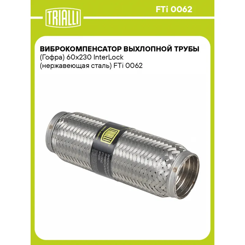 Виброкомпенсатор выхлопной трубы (Гофра) 60x230 InterLock (нержавеющая сталь) Характеристики: Артикул: FTi 0062 OEM номера: 60-230, 60x230 Гарантийный срок: 2 года/60 тыс. Количество на автомобиль: 1 Тип конструкции: InterLock Особенности конструкции:: Трёхслойная Размер ID/NL, мм: 60/230 Под трубу диаметром, мм: 59-60,3 Длина изделия (мм): 230 Материал: Нержавеющая сталь марки AISI 201 Товарная линейка: BLACK Дополнительная информация: Этикетка изделия может отличаться от представленной на фото Комплектация: Виброкомпенсатор выхлопной трубы - 1 шт Гарантия: от 1 года.