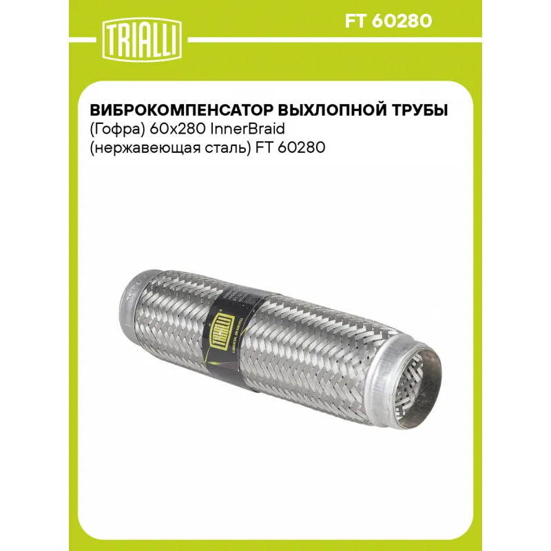 Виброкомпенсатор выхлопной трубы (Гофра) 60x280 InnerBraid (нержавеющая сталь) Характеристики: Артикул: FT 60280 OEM номера: 60-280, 60x280 Гарантийный срок: 2 года/60 тыс. Количество на автомобиль: 1 Тип конструкции: InnerBraid Особенности конструкции:: Трёхслойная Размер ID/NL, мм: 60/280 Под трубу диаметром, мм: 59-60,3 Длина изделия (мм): 280 Материал: Нержавеющая сталь марки AISI 201 Товарная линейка: BLACK Дополнительная информация: Этикетка изделия может отличаться от представленной на фото Комплектация: Виброкомпенсатор выхлопной трубы - 1 шт Гарантия: от 1 года.