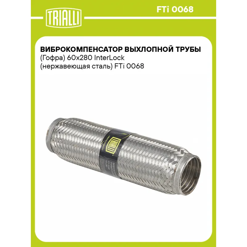 Виброкомпенсатор выхлопной трубы (Гофра) 60x280 InterLock (нержавеющая сталь) Характеристики: Артикул: FTi 0068 OEM номера: 60-280, 60x280 Гарантийный срок: 2 года/60 тыс. Количество на автомобиль: 1 Тип конструкции: InterLock Особенности конструкции:: Трёхслойная Размер ID/NL, мм: 60/280 Под трубу диаметром, мм: 59-60,3 Длина изделия (мм): 280 Материал: Нержавеющая сталь марки AISI 201 Товарная линейка: BLACK Дополнительная информация: Этикетка изделия может отличаться от представленной на фото Комплектация: Виброкомпенсатор выхлопной трубы - 1 шт Гарантия: от 1 года.