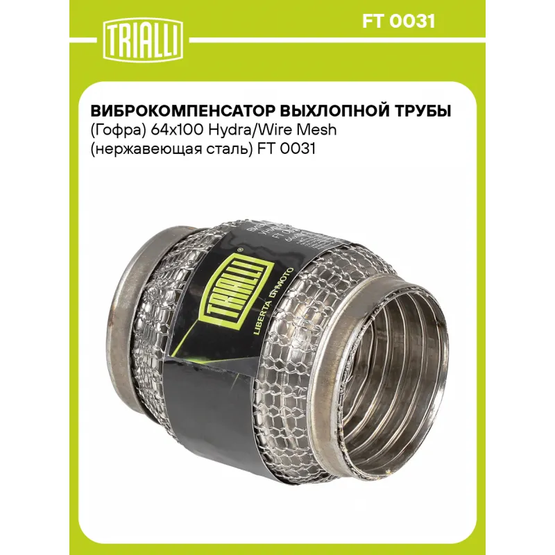 Виброкомпенсатор выхлопной трубы (Гофра) 64x100 Hydra/Wire Mesh (нержавеющая сталь) Характеристики: Артикул: FT 0031 OEM номера: 64x100, 64-100 Гарантийный срок: 2 года/60 тыс. Количество на автомобиль: 1 Тип конструкции: Wire Mesh / Hydra Особенности конструкции:: Трёхслойная Размер ID/NL, мм: 64/100 Под трубу диаметром, мм: 62-64 Длина изделия (мм): 100 Материал: Нержавеющая сталь марки AISI 201 Товарная линейка: BLACK Дополнительная информация: Этикетка изделия может отличаться от представленной на фото Комплектация: Виброкомпенсатор выхлопной трубы - 1 шт Гарантия: от 1 года.