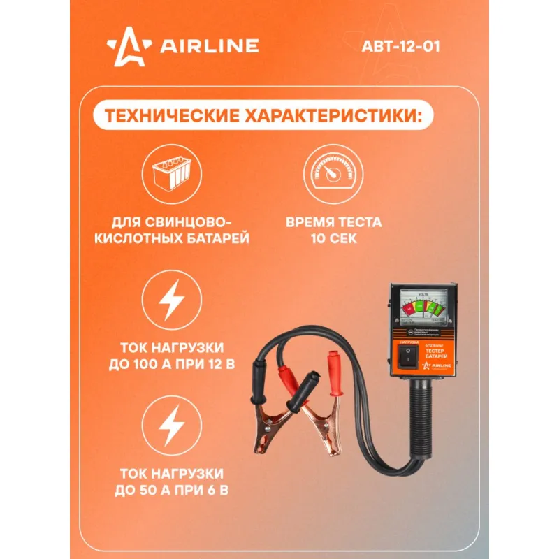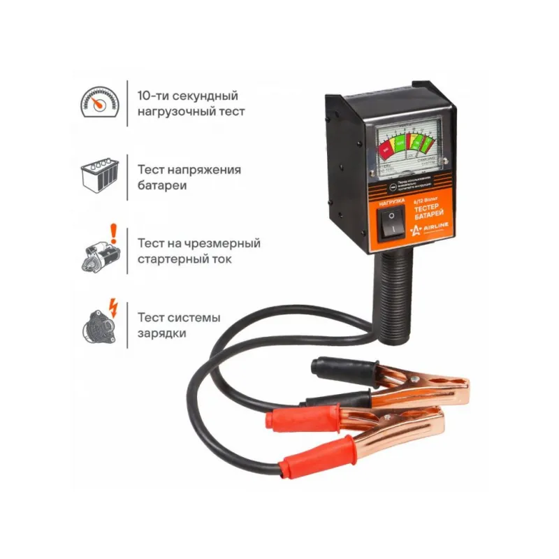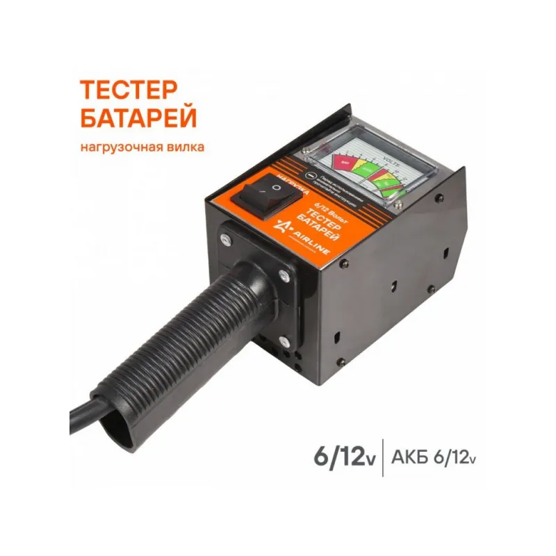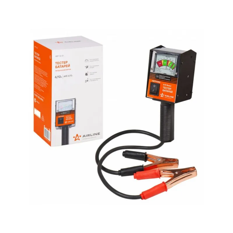 Вилка нагрузочная (Тестер батарей) Описание: Нагрузочная вилка – это незаменимое устройство для проверки состояния и готовности к эксплуатации автомобильного аккумулятора. Портативный тестер батарей от AIRLINE позволит оперативно оценить рабочее состояние автомобильной системы зарядки. Данный тип изделия подойдет для работы со свинцово- кислотными аккумуляторами 6 и 12В, ток нагрузки составляет 50А и 100А соответственно. Предназначена для экспресс оценки состояния автомобильного аккумулятора. Дополнительные возможности: - Тест системы зарядки автомобиля; - Тест стартера. Характеристики: Артикул: ABT-12-01 OEM номера: 40600 Номинальное напряжение, В: 6/12 Тип тестируемых аккумуляторных батарей: свинцово-кислотные Номинальный ток холодной прокрутки (CCA), А: до 1000 Ток нагрузки при напряжении батареи 12В, А: 100 Ток нагрузки при напряжении батареи 6В, А: 50 Комплектация: Тестер батарей - 1 шт Гарантия: от 1 года.