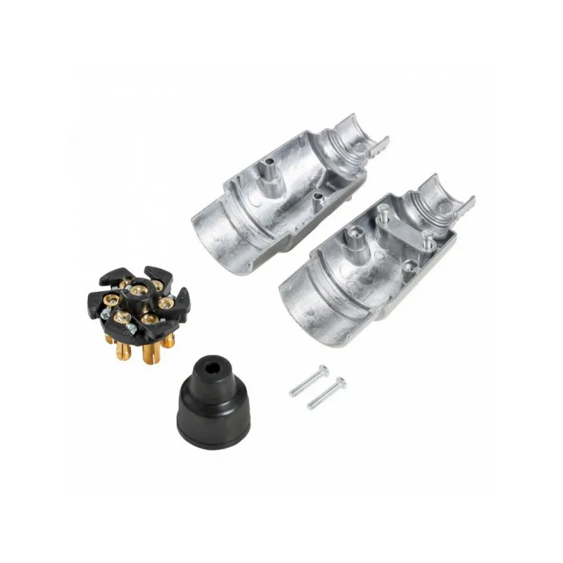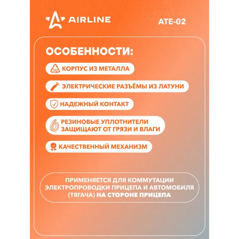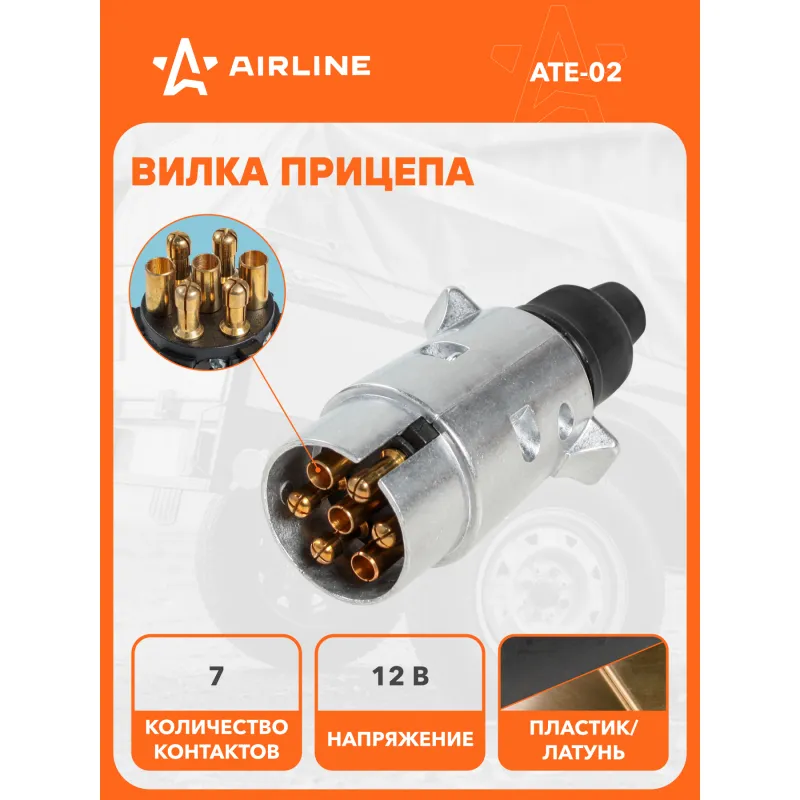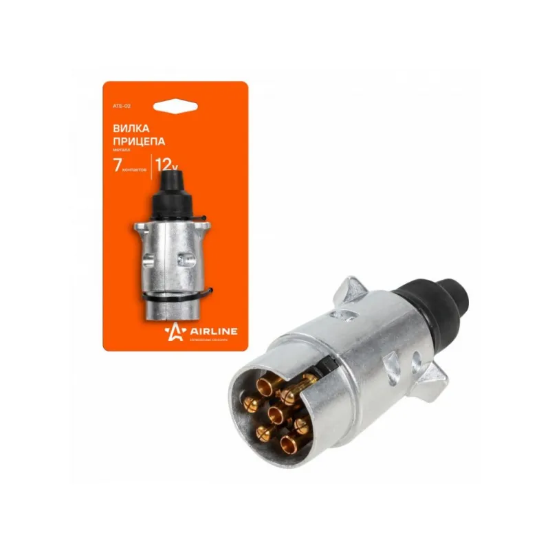 Вилка прицепа 12В 7 контактов металл Описание: Вилка для прицепа 12 В, 7 контактов AIRLINE ATE-02 выполнен из алюминия. Электрические разъёмы из латуни обеспечивают надёжный контакт. Особенности: * Корпус из алюминия; * Электрические разъемы из латуни для обеспечения надежного соединения; * Надежный контакт; * Резиновые уплотнители защищают от грязи и влаги; * Качественный механизм; Применяется для коммутации электропроводки прицепа и автомобиля (тягача) на стороне прицепа. Для самостоятельного подключения автоприцепа к автомобилю необходимо использовать разъем розетки прицепа (вилка-розетка). Соединение осуществляется путем соединения розетки, установленной на фаркопе, с соответствующим разъемом, подключенным к проводке прицепа. Товар официального производителя AIRLINE. Характеристики: Артикул: ATE-02 Количество контактов: 7 Материал корпуса: металл Комплектация: Вилка прицепа - 1 шт Гарантия: от 1 года.