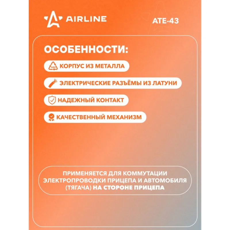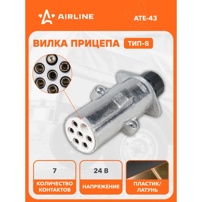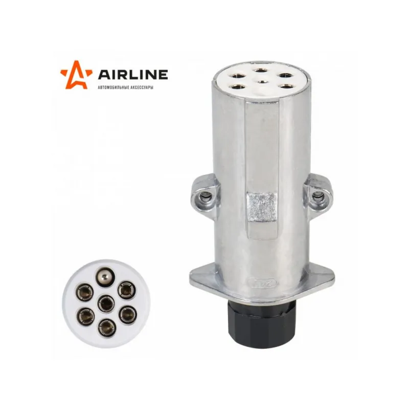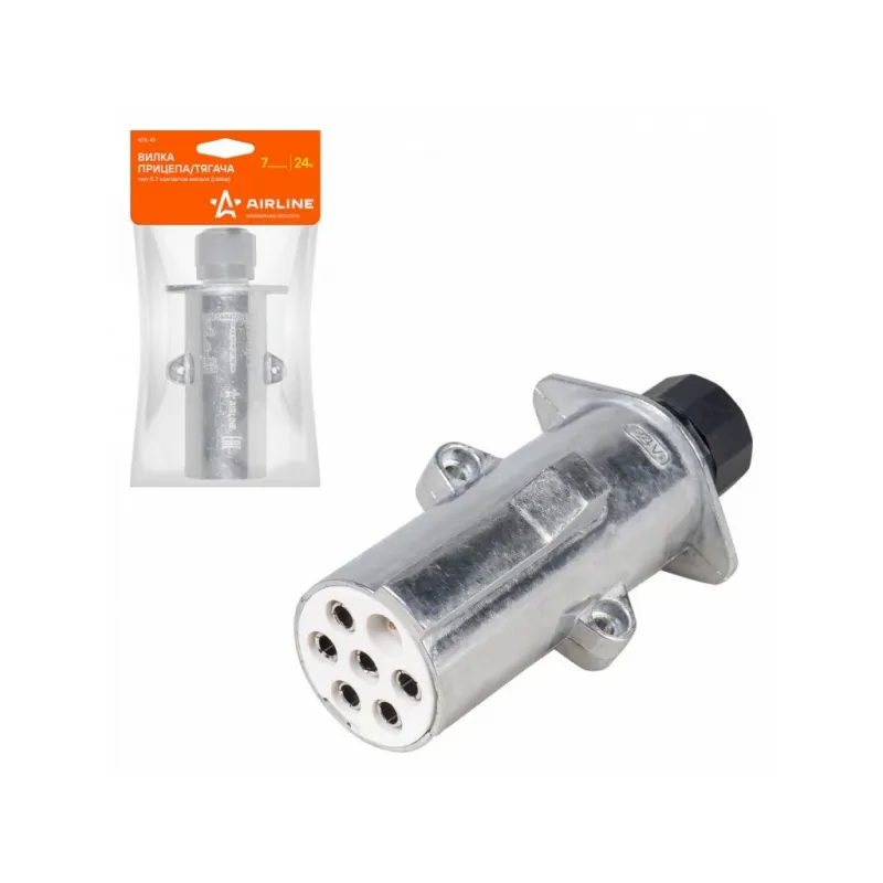 Вилка прицепа/тягача 24В тип-S 7 контактов металл (гайка) Описание: Вилка для прицепа / тягача 24 В, с пружиной, 7 контактов, тип-S AIRLINE ATE-43 выполнен из алюминия. Электрические разъёмы из латуни обеспечивают надёжный контакт. Особенности: * Корпус из алюминия; * Электрические разъемы из латуни для обеспечения надежного соединения; * Надежный контакт; * Резиновые уплотнители защищают от грязи и влаги; * Качественный механизм; Применяется для коммутации электропроводки прицепа и автомобиля (тягача) на стороне прицепа. Для самостоятельного подключения автоприцепа к автомобилю необходимо использовать разъем розетки прицепа (вилка-розетка). Соединение осуществляется путем соединения розетки, установленной на фаркопе, с соответствующим разъемом, подключенным к проводке прицепа. Товар официального производителя AIRLINE. Характеристики: Артикул: ATE-43 Количество контактов: 7 Материал корпуса: металл Комплектация: Вилка прицепа/тягача - 1 шт Гарантия: от 1 года.