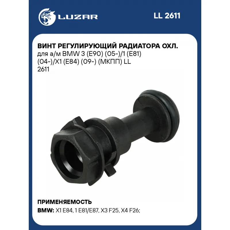 Винт регулирующий радиатора охл. для а/м BMW 3 (E90) (05-)/1 (E81) (04-)/X1 (E84) (09-) (МКПП) Характеристики: Артикул: LL 2611 OEM номера: 17117529497 Трансмиссия: MT Кондиционер: +/- Сопутствующий товар: Радиаторы охлаждения: LRc 26173; LRc 2637; LRc 26103; LRc 26119; LRc 26109 Количество на автомобиль: 1 Материал: пластик Цвет: черный Комплектация:: винт с уплотнительным кольцом EPDM Примечание: оригинальная конструкция. Винты радиаторов охлаждения LUZAR имеют другую конструкцию Назначение: для автомобилей с МКПП Подходит для авто: BMW X1 E84 (09-), 1 E81/E87 (04-), 1 E81/E87 (04-), X3 F25 (10-), X4 F26 (14-), 3 E90 (05-), 3 E90 (05-) Для проверки применяемости отправьте VIN автомобиля через вкладку "Есть вопросы о товаре?" Комплектация: Винт регулирующий (втулка управления) - 1 шт Уплотнительное резиновое кольцо - 1 шт Гарантия: от 1 года.
