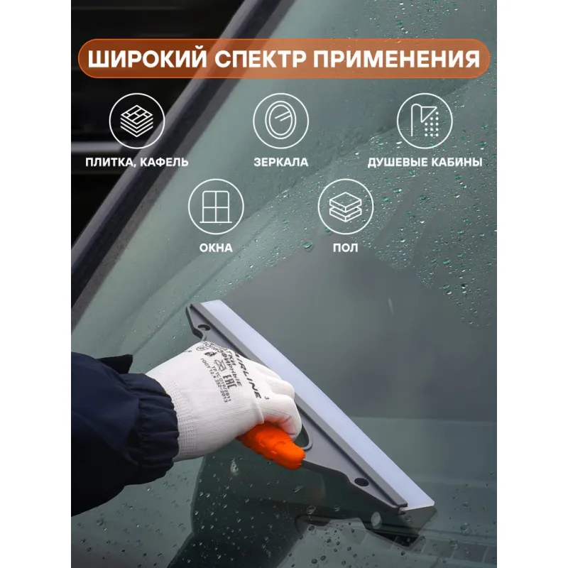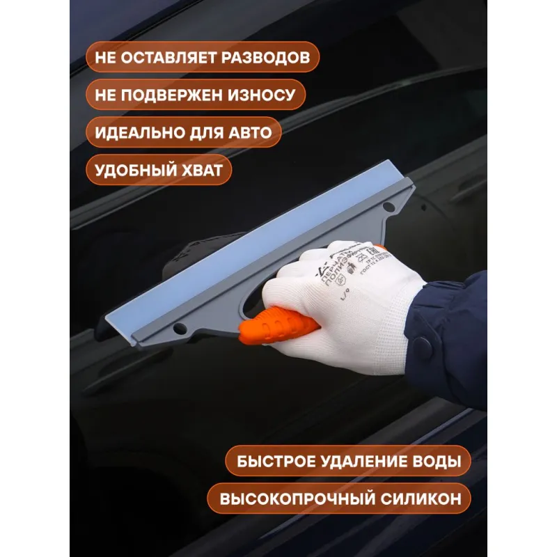 Водосгон силиконовый для удаления воды (31 см) Описание: Многофункциональный водосгон из высококачественного износостойкого силикона легко очистит автомобильные стекла, окна и зеркала, а также ламинат, плитку и другие гладкие поверхности, включая душевые стекла и подойдет как для уборки на бытовом, так и на профессиональном уровне. Водосгон данной модели бренда AIRLINE AB-M-05 отличается компактными размерами и привлекательным дизайном. Ширина рабочей поверхности изделия составляет 310 мм, что позволяет успешно использовать водосгон в бытовых целях и без затруднений хранить в салоне автомобиля. Водосгон отличается привлекательным дизайном с фирменными серо-оранжевыми цветами AIRLINE. Эргономичная легкая ручка стеклоочистителя делает чистку быстрой, легкой и удобной. Силиконовый скребок устойчив к плесени, хорошо соприкасается с очищаемой поверхностью и быстро и эффективно стягивает воду и мыльную пленку. Износостойкая резина гарантирует длительный срок эксплуатации скребка. Водосгон в автомобиль повысит уровень комфорта во время путешествий и ежедневных поездок, а также найдет применение в быту, поэтому станет нужным полезным подарком автомобилисту, мужу, папе, бату, дяде, жене, маме, сестре, тете, коллеге на 23 февраля, 8 марта, новый год. В линейке AIRLINE, вы найдете широкий ассортимент высококачественных автотоваров и средств по уходу за вашим автомобилем, щетки для окон, водосгоны, скребки, швабры. Мы гарантируем качество и надежность наших товаров. Характеристики: Артикул: AB-M-05 Длина лезвия, мм: 310 Материал лезвия: силикон Комплектация: Водосгон силиконовый с цветным воблером - 1 шт Гарантия: от 1 года.