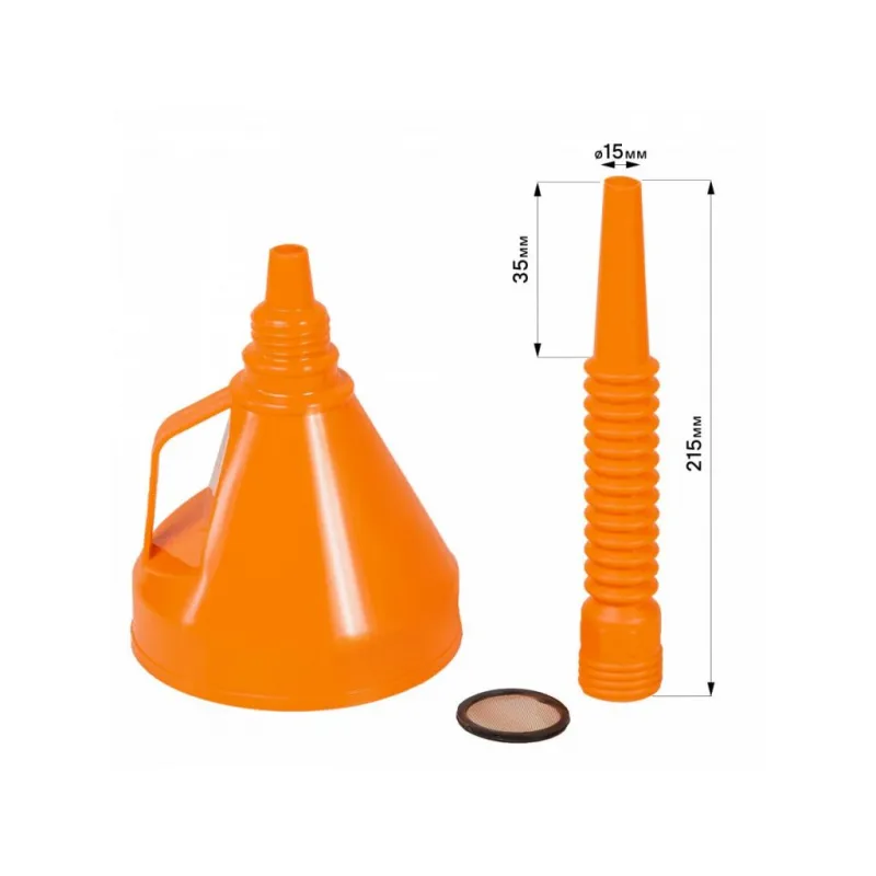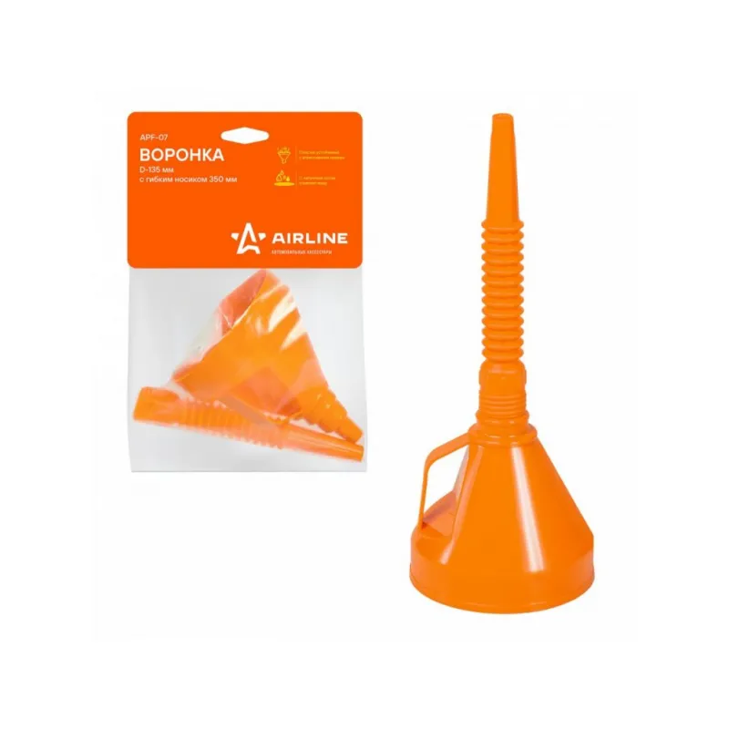 Воронка D-135мм с гибким носиком, L=350мм, латунная сетка, пакет с навершием Описание: Воронка APF-07 от бренда AIRLINE с гибким носиком и латунной сеточкой поможет аккуратно произвести процесс переливания любых жидкостей. Данная воронка имеет диаметр 135 мм. Благодаря гибкому носику воронки изделие можно расположить в любом удобном положении и под необходимым углом. Воронка укомплектована специальной латунной мелкоячеистой сеткой для фильтрации мусора при переливании, так же латунная сетка отфильтровывает воду от ГСМ. Особенности автомобильной воронки: - Пластик устойчив к агрессивным средам; - С латунным ситом отделяет воду; - Воронка складная, сборная; - Подходит для масла, бензина, топлива; Товар официального производителя AIRLINE. Отличное приобретение на подарок мужчине, женщине, автомобилисту, папе, отцу, мужу, парню и другу на Новый год, день рождения и без повода, незаменимая вещь для дома, автосервиса, для профессионального использования. Характеристики: Артикул: APF-07 Конструкция: разборная Диаметр внешний, мм: 135 Длина в сборе, мм: 350 Длина носика, мм: 215 Диаметр конца носика, мм: 15 Комплектация: Воронка D-135 мм - 1 шт Гибкий носик - 1 шт Латунная сетка - 1 шт Пакет с навершием - 1 шт Гарантия: от 1 года.