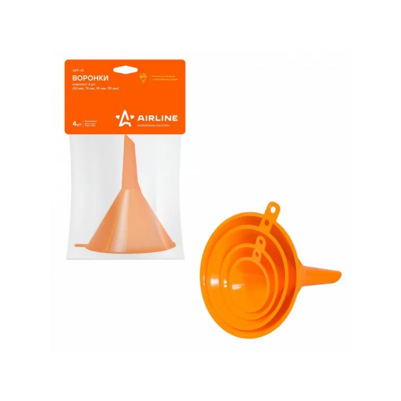Воронки комплект 4пр. (50, 75, 95, 115мм), пакет с навершием Описание: Воронки APF-01 от бренда AIRLINE помогут аккуратно произвести процесс переливания любых жидкостей. В наборе представлены 4 воронки различных размеров. Комплект воронок позволяет подобрать необходимый размер изделия исходя из потребностей при переливании. Воронки легко очищаются от загрязнений и изготовлены из прочного пластика. Особенности автомобильной воронки: - Пластик устойчив к агрессивным средам; - Воронка - неразборная; - Подходит для масла, бензина, топлива; Товар официального производителя AIRLINE. Отличное приобретение на подарок мужчине, женщине, автомобилисту, папе, отцу, мужу, парню и другу на Новый год, день рождения и без повода, незаменимая вещь для дома, автосервиса, для профессионального использования. Характеристики: Артикул: APF-01 Диаметр внешний, мм: 50; 75; 95; 115 Конструкция: неразборная Комплектация: Воронка D-50 мм - 1 шт Воронка D-75 мм - 1 шт Воронка D-95 мм - 1 шт Воронка D-115 мм - 1 шт Пакет с навершием - 1 шт Гарантия: от 1 года.