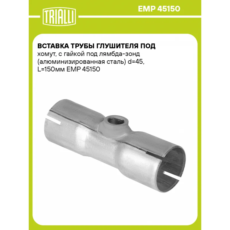 Вставка трубы глушителя под хомут, с гайкой под лямбда-зонд (алюминизированная сталь) d=45, L=150мм Характеристики: Артикул: EMP 45150 OEM номера: 285102BPF2, 286101G300, 287001G300, 287301G400, 286101W250, 286101W260, 286501W250, 287101W250, 287301G450, 8200916974, 2851026430 Количество на автомобиль: 1 Гарантийный срок: 2 года/60 тыс. Длина изделия, мм: 150 Материал: 08ПС ОЦ / Ст3 Диаметр, мм: 45 Толщина стенок: 1.5 Товарная линейка: BLACK Дополнительная информация: Этикетка изделия может отличаться от представленной на фото Комплектация: Вставка трубы глушителя - 1 шт Гарантия: от 1 года.