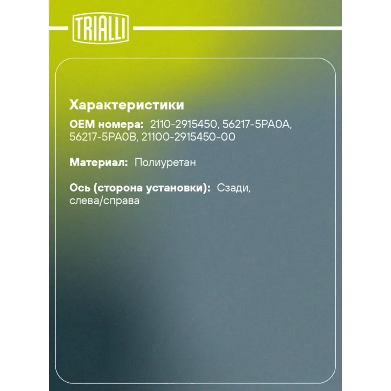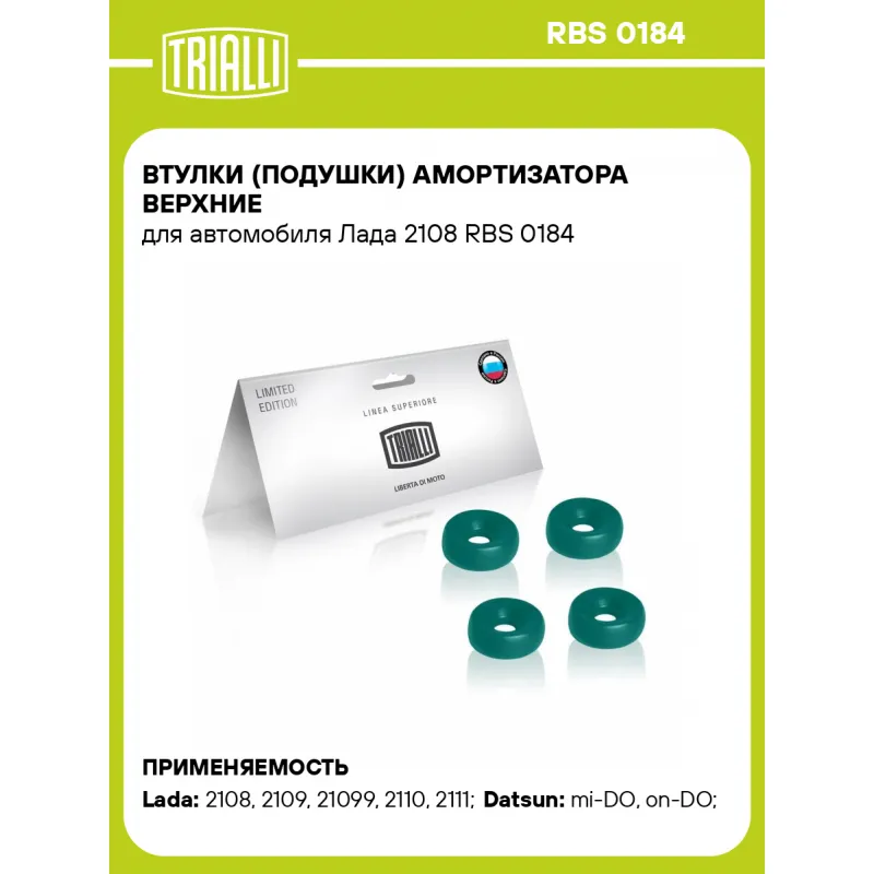 Втулки (подушки) амортизатора верхние для автомобиля Лада 2108 Характеристики: Артикул: RBS 0184 OEM номера: 2110-2915450, 56217-5PA0A, 56217-5PA0B, 21100-2915450-00 Гарантийный срок: 1 года/30 000 км Товарная линейка: PRO Количество на автомобиль: 1 Материал: Полиуретан Ось (сторона установки): Сзади, слева/справа Дополнительная информация: Цвет изделия, может отличаться от представленного на фото Количество деталей в артикуле, шт.: 4 Подходит для авто: ВАЗ 2108, 2109, 21099, 2110, 2110, 2111, 2112, 2113, 2114, 2115, Priora (07-), Kalina II (13-), Kalina (04-), 2108, 2109, 21099, Granta (10-) Datsun mi-DO (15-), on-DO (14-) Для проверки применяемости отправьте VIN автомобиля через вкладку "Есть вопросы о товаре?" Комплектация: Втулка полиуретановая - 4 шт Гарантия: от 1 года.