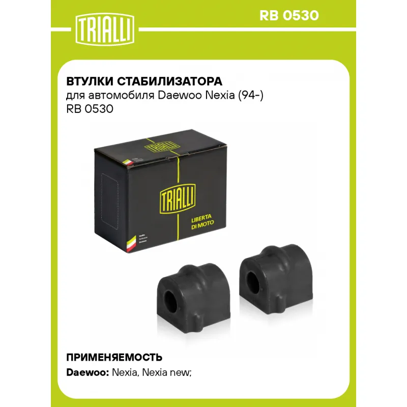 Втулки стабилизатора для автомобиля Daewoo Nexia (94-) Характеристики: Артикул: RB 0530 OEM номера: 96191890 Гарантийный срок: 1 года/30 000 км Товарная линейка: BLACK Количество на автомобиль: 1 Ось (сторона установки): Спереди, слева/справа Материал: Резина Внутренний диаметр, мм: 15 Количество деталей в артикуле, шт.: 2 Подходит для авто: Daewoo Nexia (94-), Nexia (94-), Nexia new (08-) Для проверки применяемости отправьте VIN автомобиля через вкладку "Есть вопросы о товаре?" Комплектация: Втулка стабилизатора - 2 шт Гарантия: от 1 года.