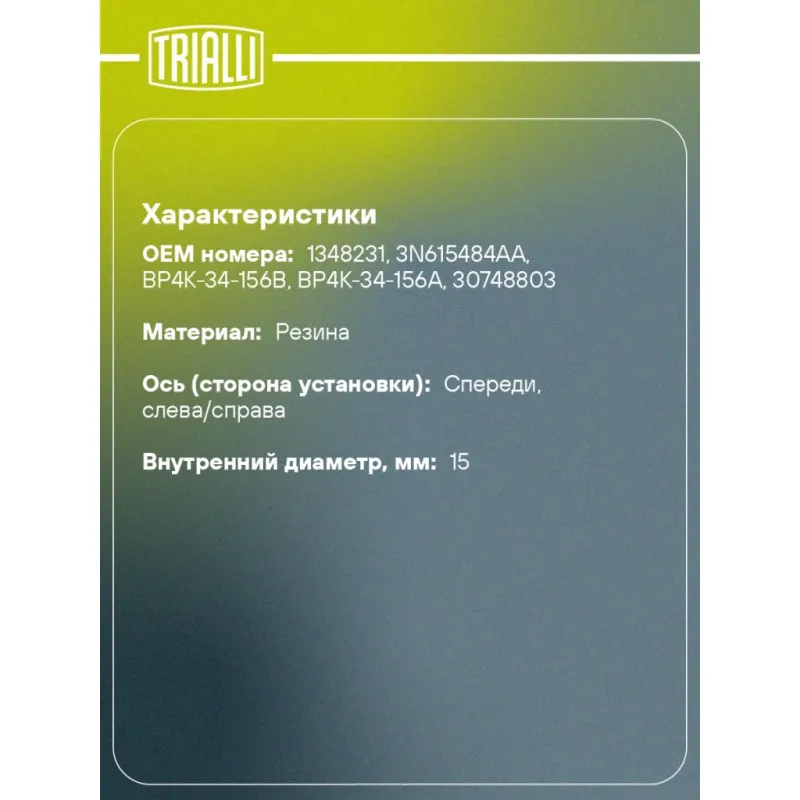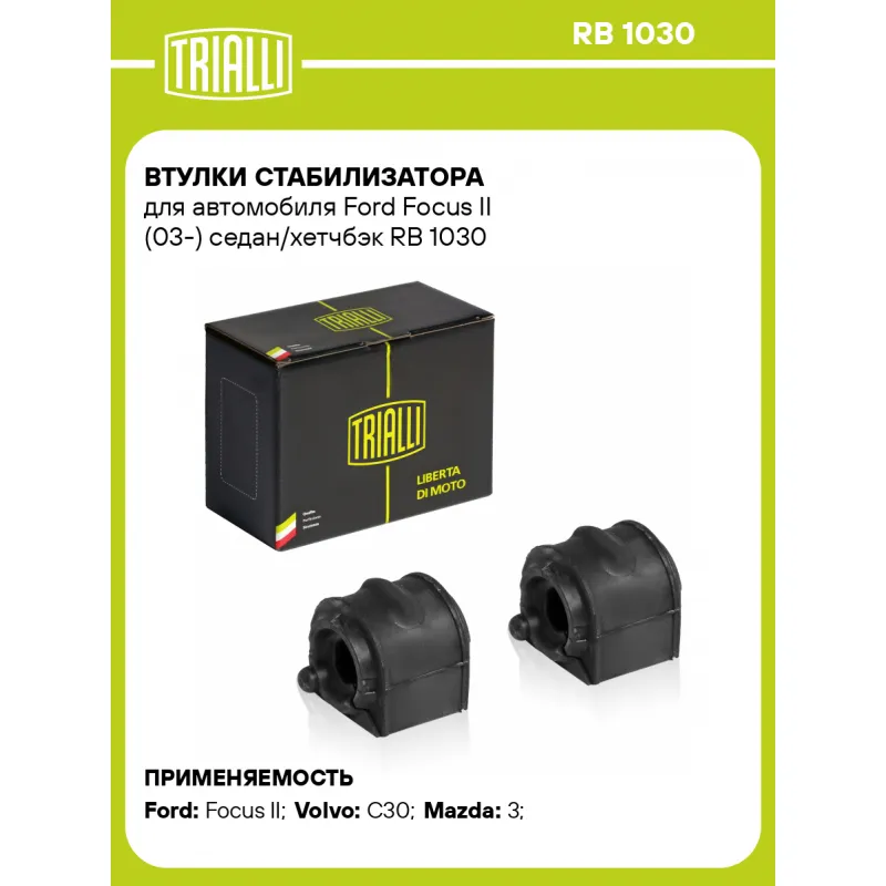 Втулки стабилизатора для автомобиля Ford Focus II (03-) седан/хетчбэк Характеристики: Артикул: RB 1030 OEM номера: 1348231, 3N615484AA, BP4K-34-156B, BP4K-34-156A, 30748803 Гарантийный срок: 1 года/30 000 км Товарная линейка: BLACK Количество на автомобиль: 1 Ось (сторона установки): Спереди, слева/справа Материал: Резина Внутренний диаметр, мм: 15 Количество деталей в артикуле, шт.: 2 Подходит для авто: Ford Focus II (05-) Volvo C30 (06-), C30 (06-) Mazda 3 (03-) Для проверки применяемости отправьте VIN автомобиля через вкладку "Есть вопросы о товаре?" Комплектация: Втулка стабилизатора - 2 шт Гарантия: от 1 года.