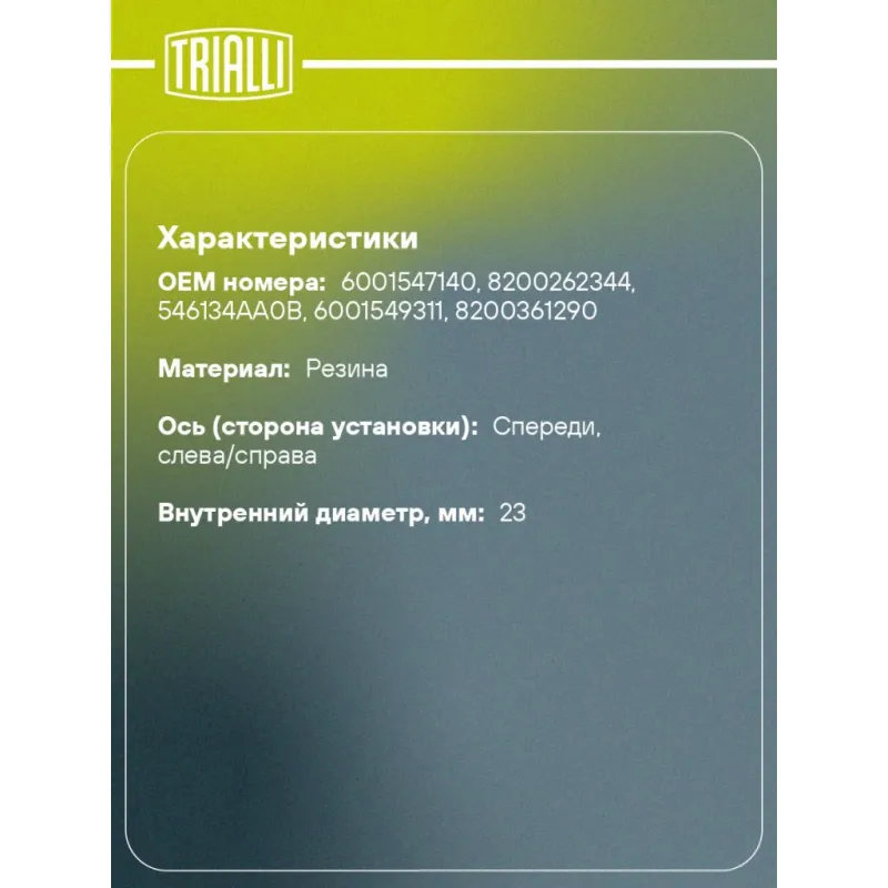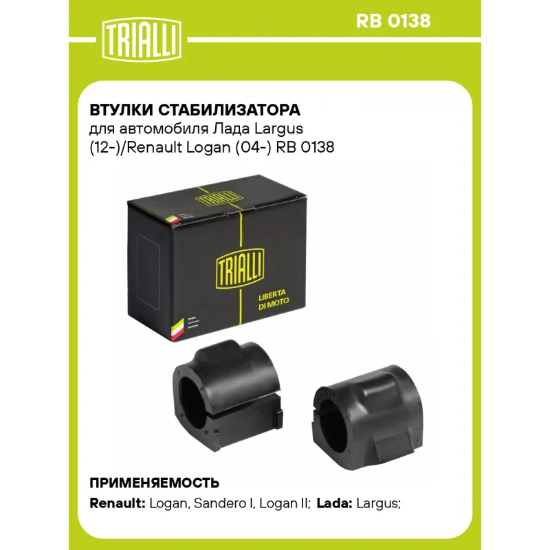 Втулки стабилизатора для автомобиля Лада Largus (12-)/Renault Logan (04-) Характеристики: Артикул: RB 0138 OEM номера: 6001547140, 8200262344, 546134AA0B, 6001549311, 8200361290 Гарантийный срок: 1 года/30 000 км Товарная линейка: BLACK Количество на автомобиль: 1 Ось (сторона установки): Спереди, слева/справа Материал: Резина Внутренний диаметр, мм: 23 Подходит для авто: Renault Logan (04-), Sandero I (09-), Logan (04-), Logan (08-), Logan II (12-), Sandero II (14-) ВАЗ Largus (12-) Для проверки применяемости отправьте VIN автомобиля через вкладку "Есть вопросы о товаре?" Комплектация: Втулка стабилизатора - 2 шт Гарантия: от 1 года.