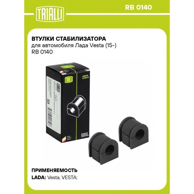 Втулки стабилизатора для автомобиля Лада Vesta (15-) Характеристики: Артикул: RB 0140 OEM номера: 8450006748 Товарная линейка: BLACK Количество на автомобиль: 1 Ось (сторона установки): Спереди, слева/справа Материал: Резина Внутренний диаметр, мм: 22 Гарантийный срок: 1 года/30 000 км Комплектация: Втулка стабилизатора - 2 шт Гарантия: от 1 года.