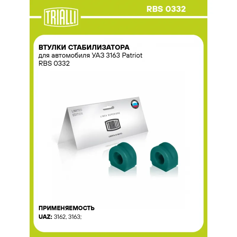 Втулки стабилизатора для автомобиля УАЗ 3163 Patriot Характеристики: Артикул: RBS 0332 OEM номера: 3162-2906041 Внутренний диаметр, мм: 26 Гарантийный срок: 1 года/30 000 км Товарная линейка: PRO Количество на автомобиль: 1 Ось (сторона установки): Спереди, слева/справа Материал: Полиуретан Дополнительная информация: Цвет изделия, может отличаться от представленного на фото Количество деталей в артикуле, шт.: 2 Подходит для авто: УАЗ 3162 (00-), 3163 (Patriot) (05-) Для проверки применяемости отправьте VIN автомобиля через вкладку "Есть вопросы о товаре?" Комплектация: Втулка полиуретановая - 2 шт Гарантия: от 1 года.