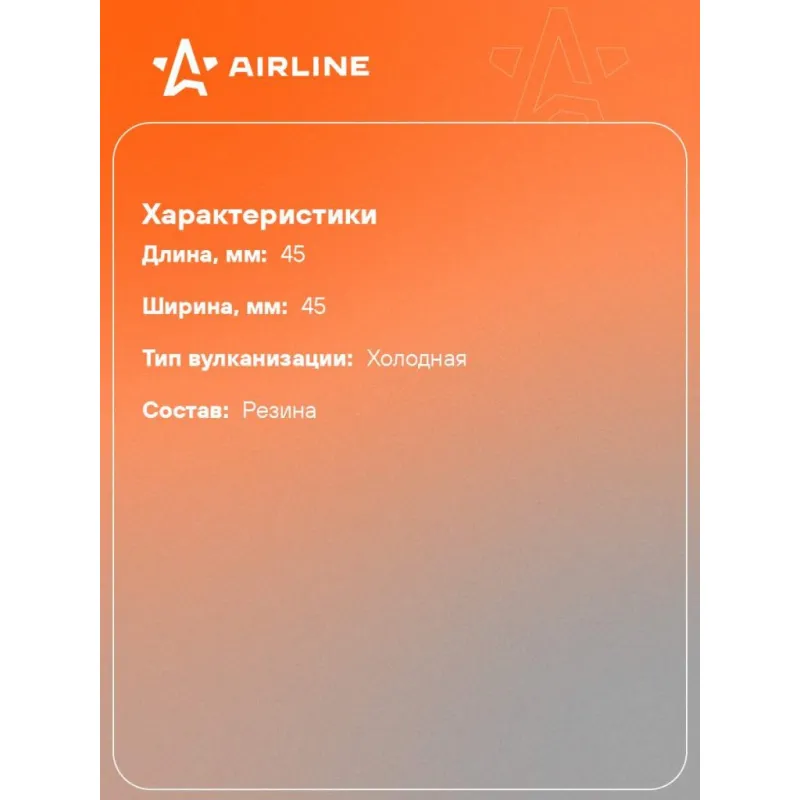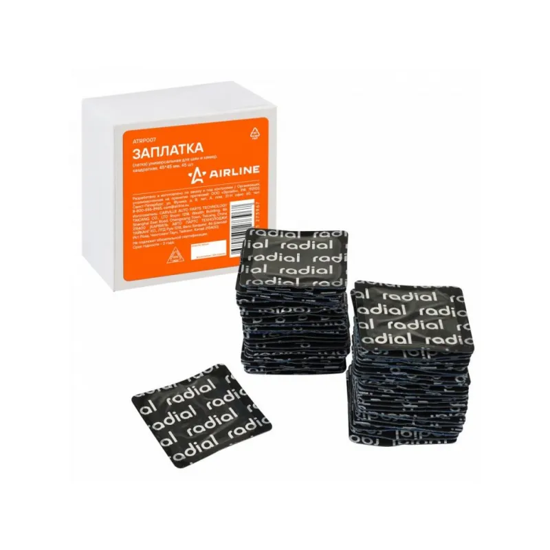 Заплата (латка) универсальная для шин и камер, квадратная, 45*45 мм, 45 шт. Описание: Заплата (латка) универсальная для бескамерных и камерных шин, овальная, 45*45 мм, 45 шт применяются для быстрого ремонта небольших повреждений в радиальных и диагональных шинах, а также в автомобильных камерах. Заплатки можно использовать для ремонта повреждений в любом месте протектора и боковых порезов. Овальные заплатки - это универсальный ремкомплект для самостоятельного ремонта и профессионального ремонта в автомастерских резиновых камер и шин автомобилей, быстрый и эффективный ремонт проколов, порезов, мелких пробоин. Размер заплатки - 45*45 мм. Тип вулканизации - Холодная. Ремонтный комплект предназначен для быстрого ремонта автомобильных и велосипедных камер. Применение: 1. Найдите место утечки воздуха. 2. Очистите ремонтируемый участок. 3. Нанесите тонкий слой клея-активатора на поверхность резины. 4. Удалите защитную фольгированную пленку с заплатки и плотно прижмите к ремонтируемой поверхности. 5. Дайте высохнуть заплатке в течение 1 часа. Они обеспечивают надежный и долговечный ремонт в любой ремонтопригодной зоне шины. Размер пластыря должен быть примерно в три раза больше повреждения. Набор из пластырей входит в базовый комплект необходимых автомобильных инструментов. Оригинальный товар от производителя Airline. Этот ремонтный комплект является незаменимым помощником в экстренных ситуациях и подходит для ремонта шин/ камер различных видов транспортных средств (автомобилей, велосипедов, мотоциклов), станет отличным подарком другу, мужу, каждому автомобилисту. Такой ремонтный комплект всегда должен быть под рукой. Характеристики: Артикул: ATRP007 Длина, мм: 45 Ширина, мм: 45 Форма: Квадратная Тип вулканизации: Холодная Комплектация: Заплатки - 45 шт Коробка - 1 шт Гарантия: от 1 года.