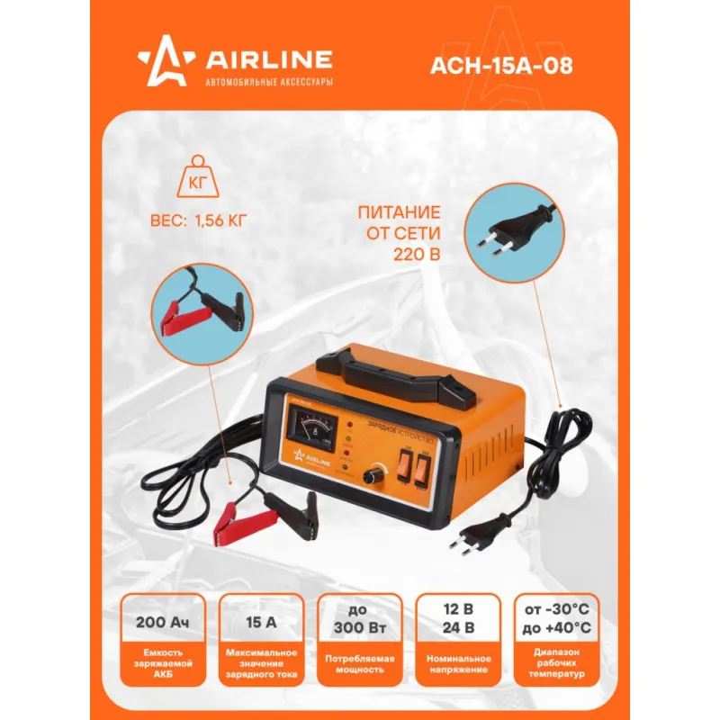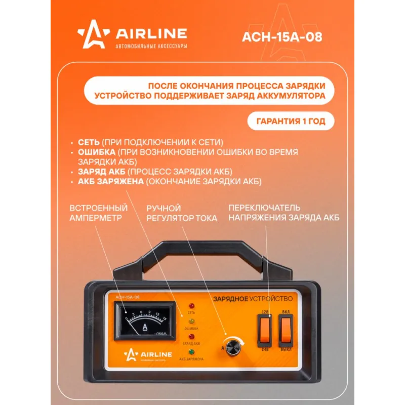 Зарядное устройство 0-15А 12В/24В импульсное, амперметр, ручная регулировка Описание: Автоматическое импульсное зарядное устройство (ЗУ) предназначено для зарядки свинцово-кислотных аккумуляторных батарей всех типов (с жидким электролитом, GEL, AGM, обслуживаемых/необслуживаемых, Ca, Ag) с номинальным напряжением 12В/24В. Позволяет заряжать АКБ емкостью до 200Аh. Зарядка происходит в автоматическом режиме с возможностью ручной регулировки зарядного тока. После подключения ЗУ и установки зарядного тока, начнется процесс зарядки АКБ. Индикатор “ЗАРЯД АКБ” будет гореть красным цветом, индикатор “АКБ ЗАРЯЖЕНА” не будет гореть. Когда напряжение заряда достигнет 29В для 24В или 14,5V для 12V батарей, батарея полностью зарядится. После окончания зарядки устройство поддерживает заряд АКБ длительное время. Зарядное устройство для аккумулятора увеличивает срок службы АКБ. ЗУ может быть использовано для зарядки АКБ не только автомобиля, но и мотоцикла, квадроцикла, лодки, снегохода. В комплекте вы найдете подробную инструкцию по эксплуатации и гарантийный талон. Зарядное устройство для АКБ должно быть в машине у каждого автомобилиста, приобретайте его в подарок и для собственного пользования. В нашем магазине, вы найдете широкий ассортимент высококачественных авто запчастей, ремонтные комплекты, инструменты, аксессуары для автомобиля, электрооборудование, зарядники, стартеры, и многое другое. Характеристики: Артикул: ACH-15A-08 Максимальная потребляемая мощность, Вт: 300 Встроенный амперметр: есть Диапазон рабочих температур, °C: -30 - +40 Максимальная емкость заряжаемой АКБ, Ач: 200 Максимальное значение зарядного тока, А: 15 Напряжение питания ± 5%, В: 220 Частота сети, Гц: 50 Встроенный вентилятор: есть Комплектация: Зарядное устройство - 1 шт Инструкция - 1 шт Гарантийный талон - 1 шт Коробка - 1 шт Гарантия: от 1 года.