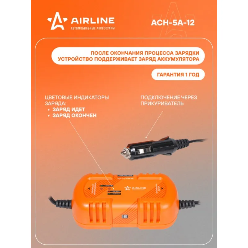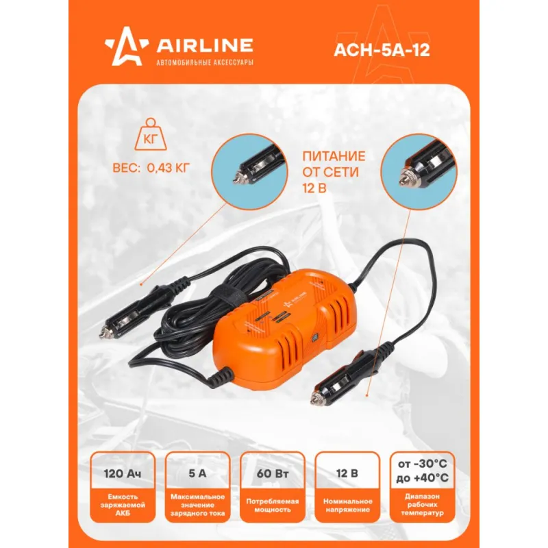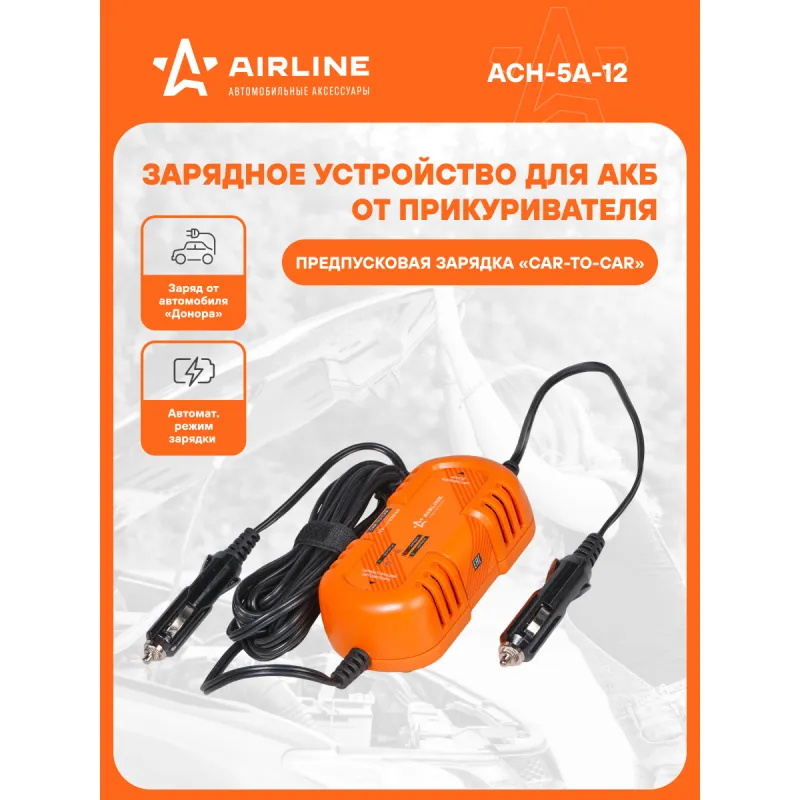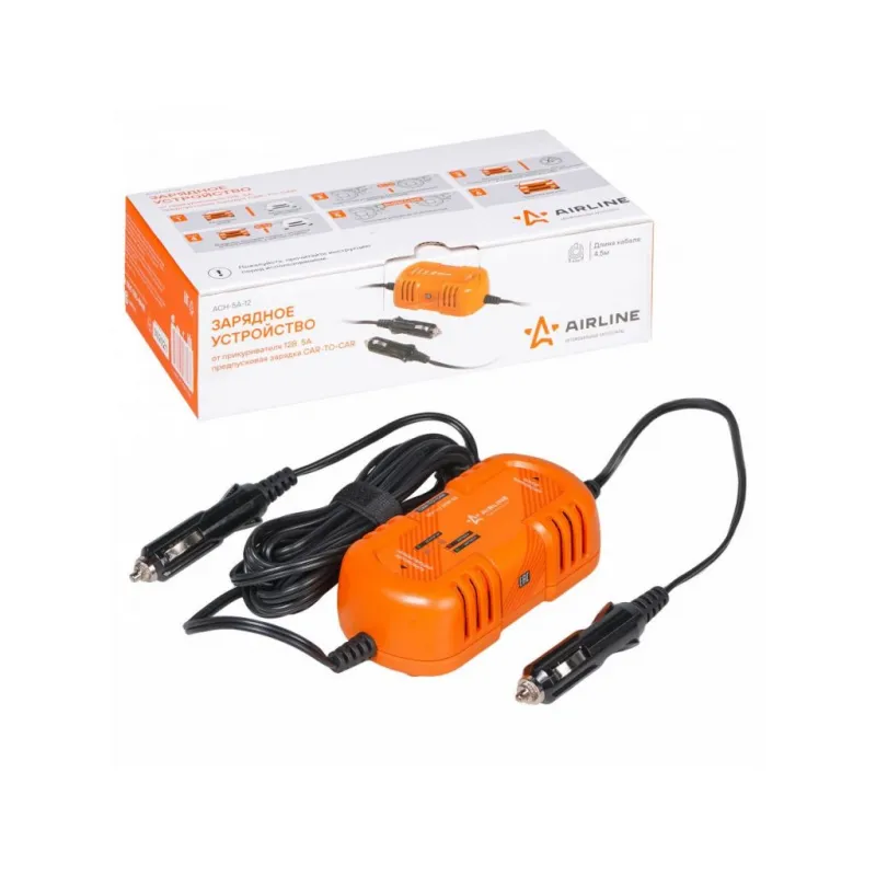 Зарядное устройство от прикуривателя 12В, 5А (предпусковая зарядка CAR-TO-CAR) Описание: Зарядное устройство CAR TO CAR это прибор, который способен заряжать автомобильный аккумулятор не снимая его с автомобиля от розетки прикуривателя другого автомобиля - "донора" в любом месте (стоянка, в дороге). Отличается удобством и легкостью подключения благодаря длинному кабелю (4,5 м), подключаемому в гнезда прикуривателя. Полностью автоматическая работа устройства защит электрику, предохранители и электронику автомобиля донора, поддерживая зарядный ток не более 5А. Световые индикаторы на зарядном устройстве отображают работу устройства (заряд идёт, заряд окончен). В комплекте вы найдете подробную инструкцию по эксплуатации и гарантийный талон. Характеристики: Артикул: ACH-5A-12 Максимальная потребляемая мощность, Вт: 60 Длина кабеля, м: 4.5 Диапазон рабочих температур, °C: -30 - +40 Максимальная емкость заряжаемой АКБ, Ач: 120 Максимальное значение зарядного тока, А: 5 Напряжение питания ± 5%, В: 12 Встроенный вентилятор: нет Комплектация: Зарядное устройство - 1 шт Инструкция - 1 шт Коробка - 1 шт Гарантия: от 1 года.