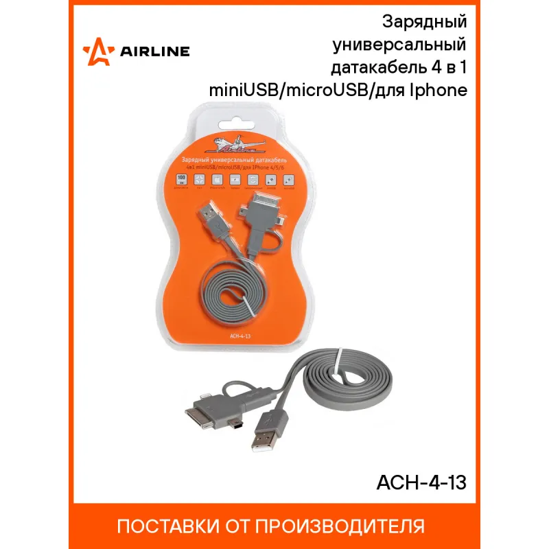 Зарядный универсальный датакабель 4 в 1 miniUSB/microUSB/для Iphone Описание: Датакабель для зарядки гаджетов от розетки USB и передачи данных. Имеет удобный магнитный коннектор для быстрого присоединения к устройству. Характеристики: Артикул: ACH-4-13 Длина кабеля (включая штекер), см: 100 Напряжение питания, В: 5 Комплектация: Кабель в блистере - 1 шт Гарантия: от 1 года.