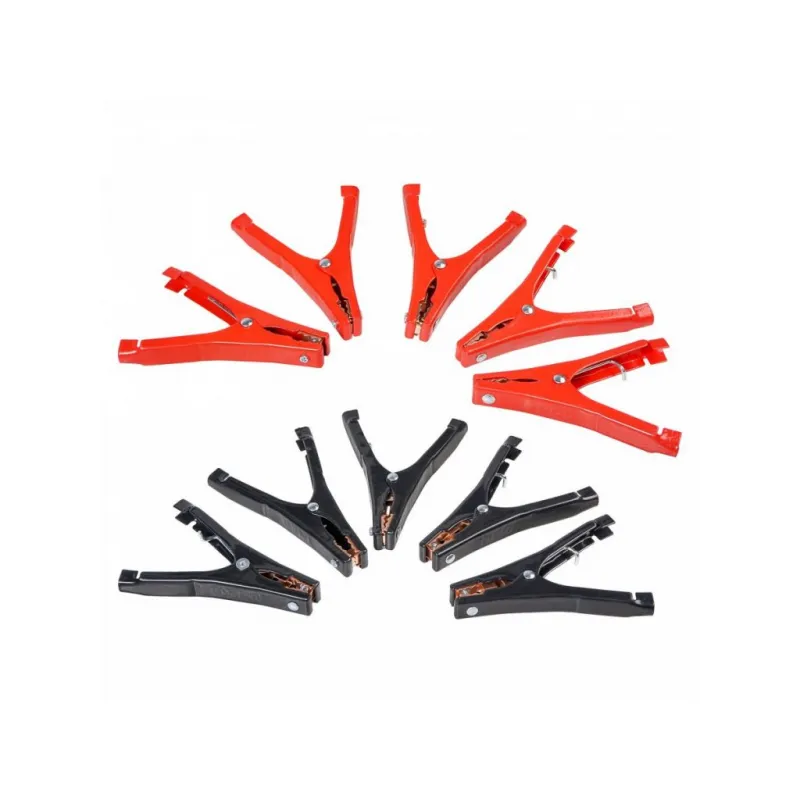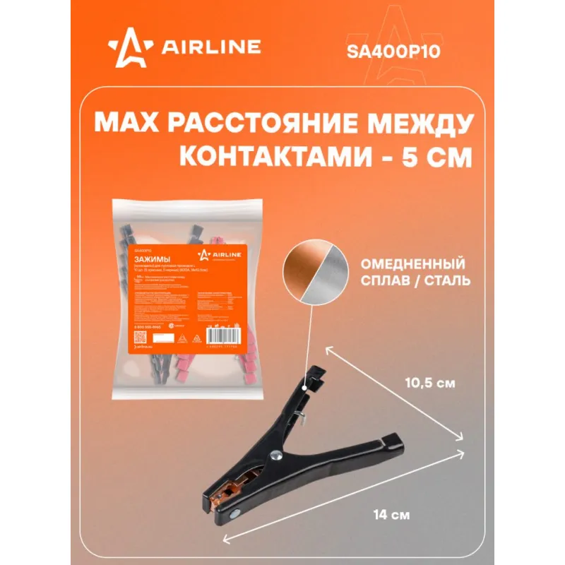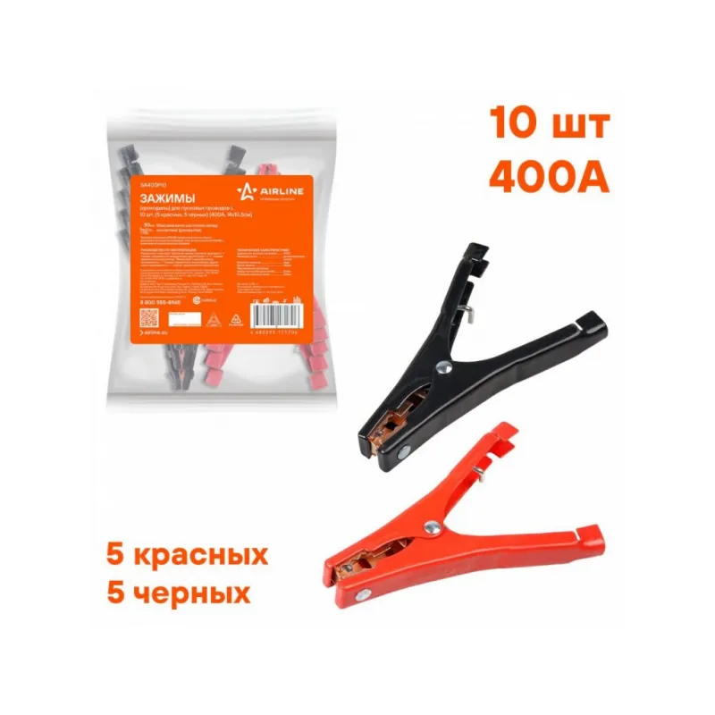 Зажимы (крокодилы) для пусковых проводов L (10 шт.) (400А, 14х10,5см) Описание: Пусковые крокодилы зажимы Airline предназначены для запуска двигателей легковых автомобилей, а так же мотоциклов (6/12/24В) с разряженной аккумуляторной батареей. Зажимы для пусковых проводов L обладает изолированным корпусом стойким к ударам, морозам и химическим веществам. Позволяет производить запуск двигателя в условиях низких температур (-40С). Максимальное расстояние между контактами (раскрытие), 50 мм. Прочная морозостойкая изоляция. С помощью зажимов можно создавать соединительные, измерительные и подстыковочные провода. Изделие применяется в строительстве, станко-приборостроение, производстве и в транспорте. Будет хорошим приобретением в подарок себе, мужу, брату, другу и каждому автомобилисту. Характеристики: Артикул: SA400P10 Материал зажимов: омедненная сталь Материал покрытия ручек: диэлектрическая краска Сила тока, А: 400 Рабочая температура, C: от - 40 до + 80 Длина зажима, мм: 140 Максимальное растояние между контактами (раскрытие), мм: 50 Расстояние между ручками, мм: 105 Комплектация: Зажимы для проводов красного цвета - 5 шт Зажимы для проводов черного цвета - 5 шт Пакет со стикером - 1 шт Гарантия: от 1 года.