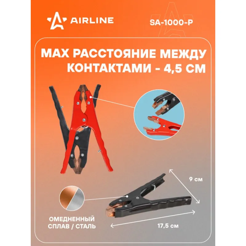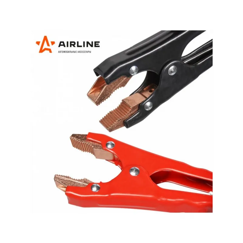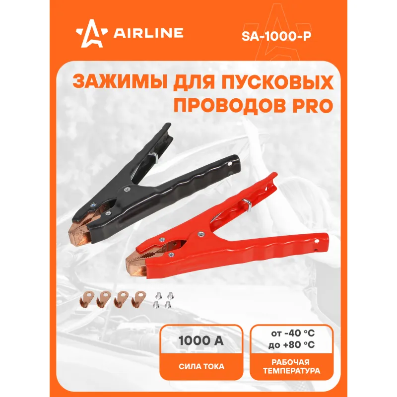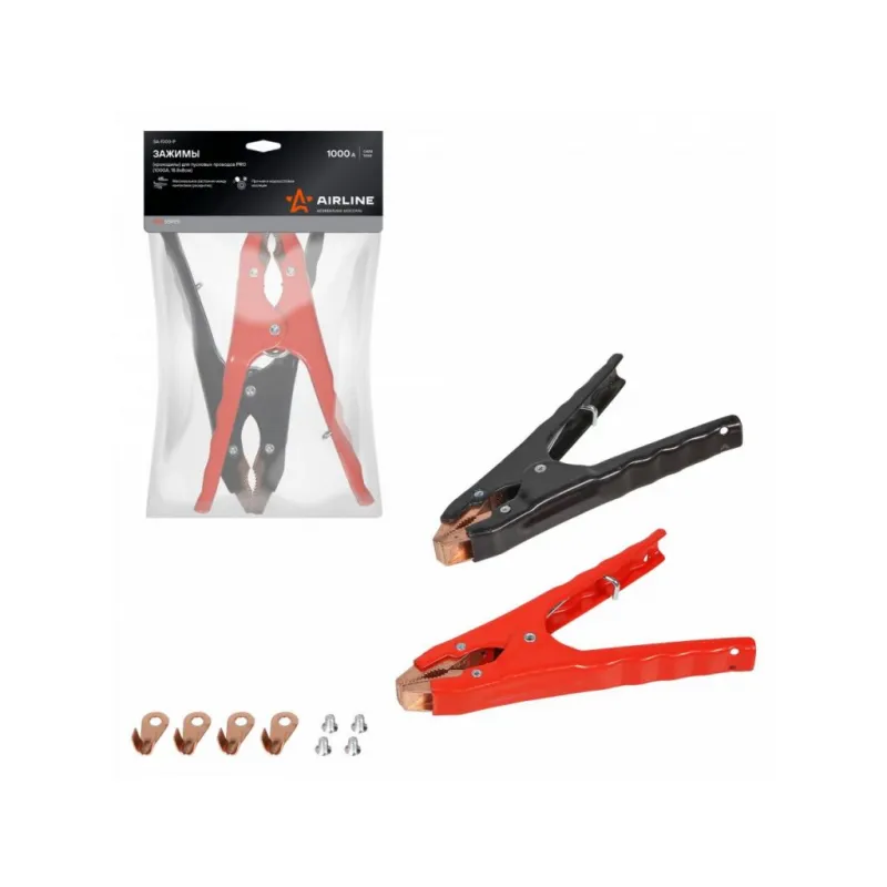 Зажимы (крокодилы) для пусковых проводов PRO (2 шт.) (1000А, 18,8х 8см) Описание: Пусковые крокодилы зажимы Airline предназначены для запуска двигателей легковых автомобилей, а так же мотоциклов (6/12/24В) с разряженной аккумуляторной батареей. Зажимы для пусковых проводов обладает изолированным корпусом стойким к ударам, морозам и химическим веществам. Позволяет производить запуск двигателя в условиях низких температур (-40С). Максимальное расстояние между контактами (раскрытие), 45 мм. Прочная морозостойкая изоляция. С помощью зажимов можно создавать соединительные, измерительные и подстыковочные провода. Изделие применяется в строительстве, станко-приборостроение, производстве и в транспорте. Будет хорошим приобретением в подарок себе, мужу, брату, другу и каждому автомобилисту. Характеристики: Артикул: SA-1000-P OEM номера: SA-1000-06E Материал покрытия ручек: диэлектрическая краска Сила тока, А: 1000 Рабочая температура, C: от - 40 до + 80 Материал зажимов: омедненный сплав Длина зажима, мм: 175 Максимальное растояние между контактами (раскрытие), мм: 45 Расстояние между ручками, мм: 90 Комплектация: Зажимы для проводов - 2 шт Клемма - 4 шт Болт- - 4 шт Пакет с навершием - 1 шт Гарантия: от 1 года.