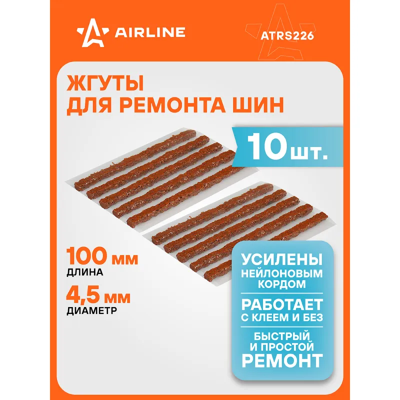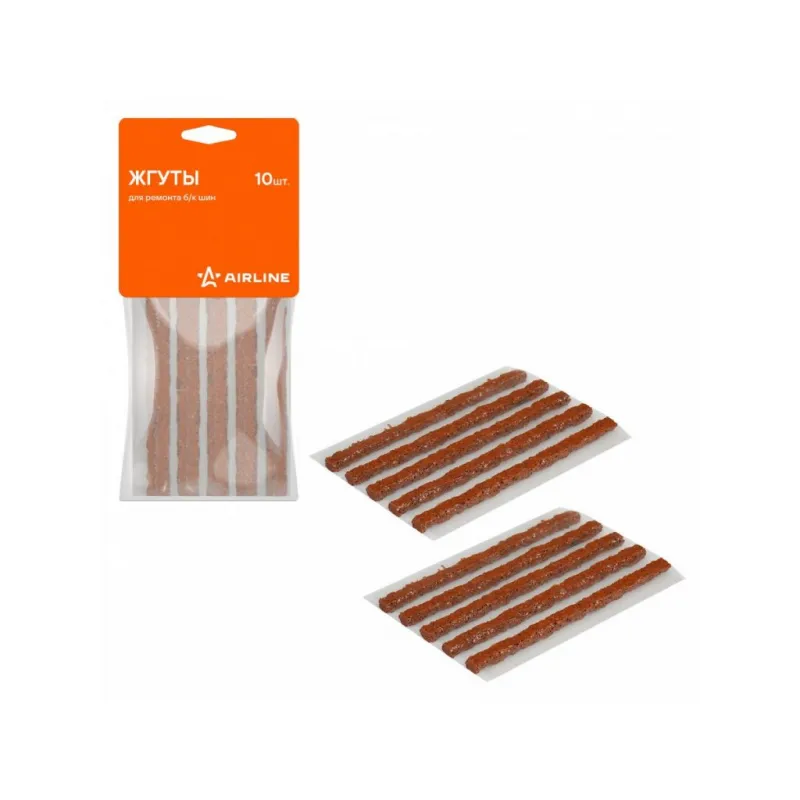 Жгуты для ремонта б/к шин, 4.5*100мм, 10 шт., коричневые, ПВХ подложка, в пакете Описание: Жгуты для ремонта б/к шин 4,5*100 мм ATRS226 от бренда AIRLINE из бутилкаучука используются для заделывания проколов в шинах авто- и мототехники. Состав - Бутилкаучук, нейлон. Благодаря армированию нейлоновым кордом удалось добиться лучших показателей по долговечности и износостойкости. Ремонтный комплект должен быть в наборе инструментов для автомобиля, ведь он поможет произвести экстренный ремонт бескамерных шин. Жгут для ремонта бескамерных шин поможет самостоятельно устранить повреждения без обращения в автосервис. Набор жгутов ремонтный автомобильный является бюджетным вариантом оказания ремонтных услуг с базовым комплектом необходимых инструментов. Профессиональный ремкомплект для б/к шин позволяет лучше заделать микротрещины. Пару минут ожидания высыхания заплатки и машина готова, можно ехать! Набор для ремонта бескамерных шин является незаменимым помощником в экстренных ситуациях и подходит для ремонта шин различных видов транспортных средств (автомобилей, велосипедов, мотоциклов и других шин). Аксессуар в машину пригодится каждому автомобилисту, удобно хранить в машине, в гараже. Характеристики: Артикул: ATRS226 Длина жгута, мм: 100 Диаметр жгута, мм: 4,5 Комплектация: Пакет - 1 шт Жгуты - 10 шт Гарантия: от 1 года.