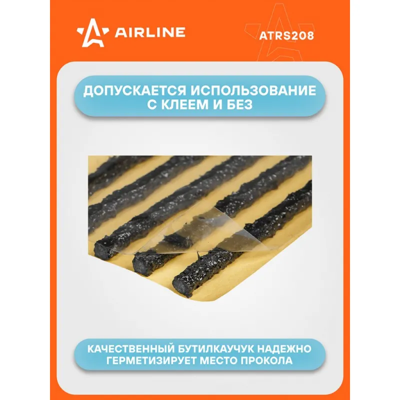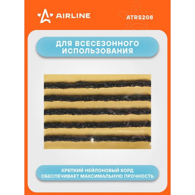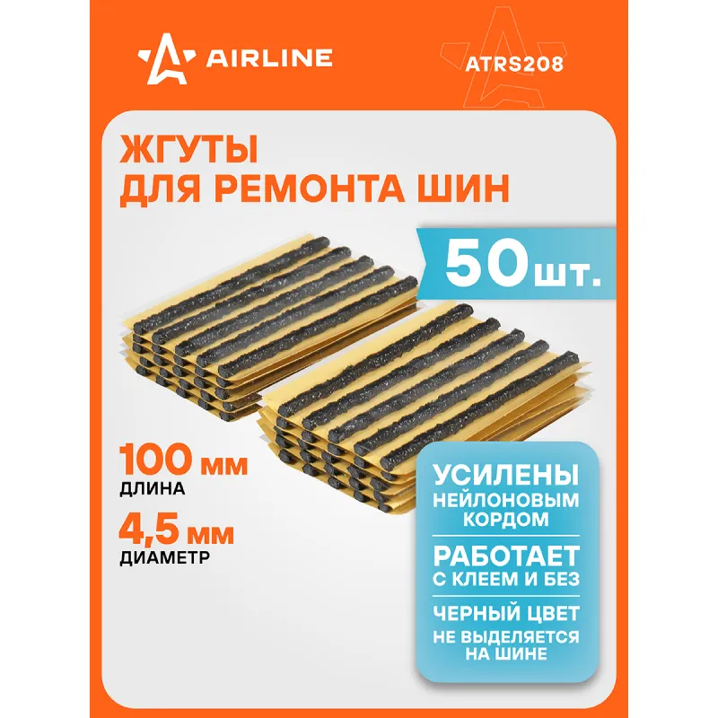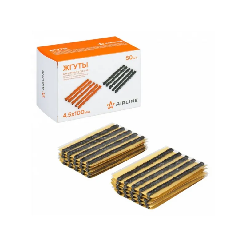 Жгуты для ремонта б/к шин, 4.5*100мм, 50 шт, черные, бумажн. подложка, в коробке Описание: Жгуты для ремонта б/к шин 4,5*100 мм ATRS208 от бренда AIRLINE из бутилкаучука используются для заделывания проколов в шинах авто- и мототехники. Состав - Бутилкаучук, нейлон. Благодаря армированию нейлоновым кордом удалось добиться лучших показателей по долговечности и износостойкости. Ремонтный комплект должен быть в наборе инструментов для автомобиля, ведь он поможет произвести экстренный ремонт бескамерных шин. Жгут для ремонта бескамерных шин поможет самостоятельно устранить повреждения без обращения в автосервис. Набор жгутов ремонтный автомобильный является бюджетным вариантом оказания ремонтных услуг с базовым комплектом необходимых инструментов. Профессиональный ремкомплект для б/к шин позволяет лучше заделать микротрещины. Пару минут ожидания высыхания заплатки и машина готова, можно ехать! Набор для ремонта бескамерных шин является незаменимым помощником в экстренных ситуациях и подходит для ремонта шин различных видов транспортных средств (автомобилей, велосипедов, мотоциклов и других шин). Аксессуар в машину пригодится каждому автомобилисту, удобно хранить в машине, в гараже. Характеристики: Артикул: ATRS208 Длина жгута, мм: 100 Диаметр жгута, мм: 4,5 Комплектация: Коробка - 1 шт Жгуты - 50 шт Гарантия: от 1 года.