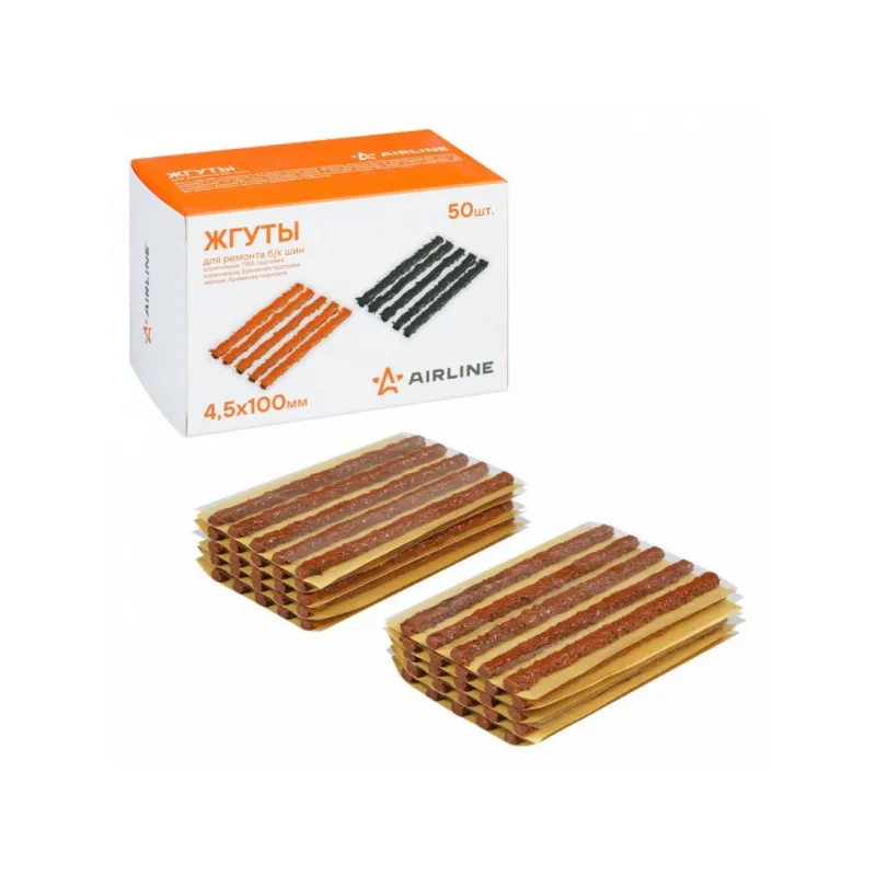 Жгуты для ремонта б/к шин, 4.5*100мм, 50 шт., коричневые, бумажная подложка, в коробке Описание: Жгуты для ремонта б/к шин 4,5*100 мм ATRS202 от бренда AIRLINE из бутилкаучука используются для заделывания проколов в шинах авто- и мототехники. Состав - Бутилкаучук, нейлон. Благодаря армированию нейлоновым кордом удалось добиться лучших показателей по долговечности и износостойкости. Ремонтный комплект должен быть в наборе инструментов для автомобиля, ведь он поможет произвести экстренный ремонт бескамерных шин. Жгут для ремонта бескамерных шин поможет самостоятельно устранить повреждения без обращения в автосервис. Набор жгутов ремонтный автомобильный является бюджетным вариантом оказания ремонтных услуг с базовым комплектом необходимых инструментов. Профессиональный ремкомплект для б/к шин позволяет лучше заделать микротрещины. Пару минут ожидания высыхания заплатки и машина готова, можно ехать! Набор для ремонта бескамерных шин является незаменимым помощником в экстренных ситуациях и подходит для ремонта шин различных видов транспортных средств (автомобилей, велосипедов, мотоциклов и других шин). Аксессуар в машину пригодится каждому автомобилисту, удобно хранить в машине, в гараже. Характеристики: Артикул: ATRS202 Длина жгута, мм: 100 Диаметр жгута, мм: 4,5 Комплектация: Жгуты - 50 шт Коробка - 1 шт Гарантия: от 1 года.