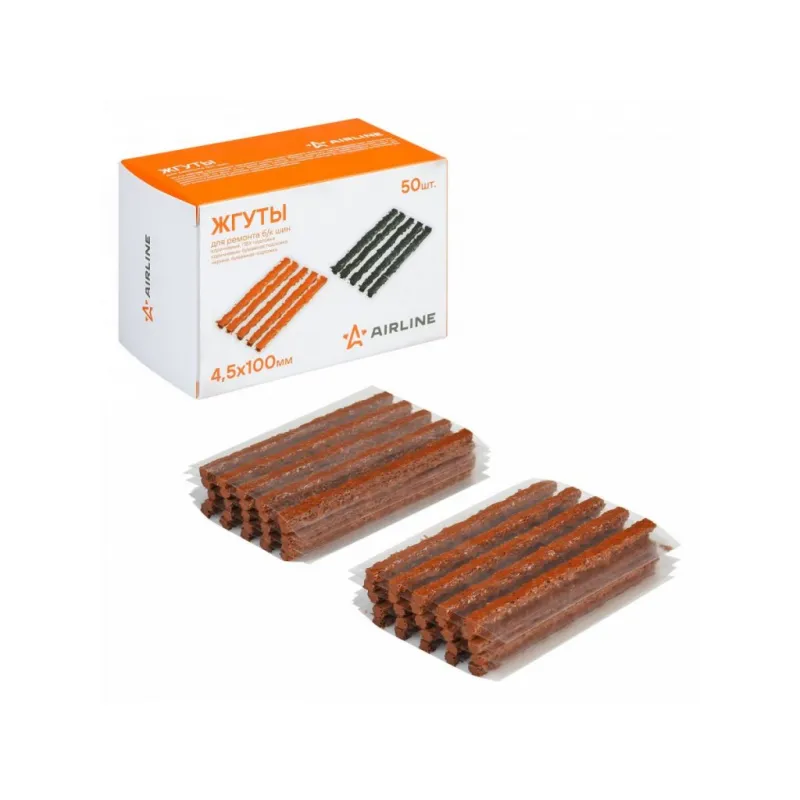 Жгуты для ремонта б/к шин, 4.5*100мм, 50 шт, коричневые, ПВХ подложка, в коробке Описание: Жгуты для ремонта б/к шин 4,5*100 мм ATRS214 от бренда AIRLINE из бутилкаучука используются для заделывания проколов в шинах авто- и мототехники. Состав - Бутилкаучук, нейлон. Благодаря армированию нейлоновым кордом удалось добиться лучших показателей по долговечности и износостойкости. Ремонтный комплект должен быть в наборе инструментов для автомобиля, ведь он поможет произвести экстренный ремонт бескамерных шин. Жгут для ремонта бескамерных шин поможет самостоятельно устранить повреждения без обращения в автосервис. Набор жгутов ремонтный автомобильный является бюджетным вариантом оказания ремонтных услуг с базовым комплектом необходимых инструментов. Профессиональный ремкомплект для б/к шин позволяет лучше заделать микротрещины. Пару минут ожидания высыхания заплатки и машина готова, можно ехать! Набор для ремонта бескамерных шин является незаменимым помощником в экстренных ситуациях и подходит для ремонта шин различных видов транспортных средств (автомобилей, велосипедов, мотоциклов и других шин). Аксессуар в машину пригодится каждому автомобилисту, удобно хранить в машине, в гараже. Характеристики: Артикул: ATRS214 Длина жгута, мм: 100 Диаметр жгута, мм: 4,5 Комплектация: Жгуты - 50 шт Коробка - 1 шт Гарантия: от 1 года.