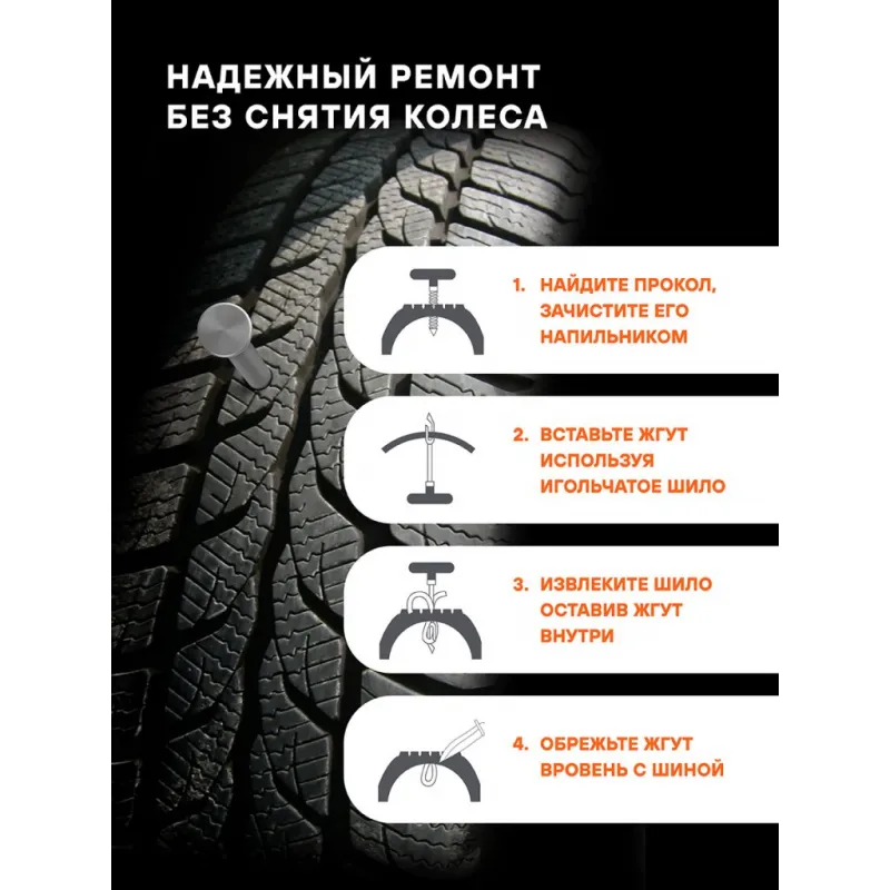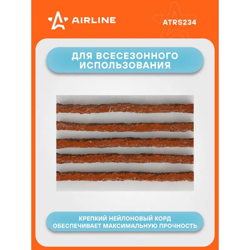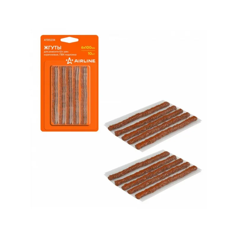 Жгуты для ремонта б/к шин, 6*100мм, 10 шт., коричневые, ПВХ подложка, в блистере Описание: Жгуты для ремонта б/к шин 6*100 мм ATRS234 от бренда AIRLINE из бутилкаучука используются для заделывания проколов в шинах авто- и мототехники. Состав - Бутилкаучук, нейлон. Благодаря армированию нейлоновым кордом удалось добиться лучших показателей по долговечности и износостойкости. Ремонтный комплект должен быть в наборе инструментов для автомобиля, ведь он поможет произвести экстренный ремонт бескамерных шин. Жгут для ремонта бескамерных шин поможет самостоятельно устранить повреждения без обращения в автосервис. Набор жгутов ремонтный автомобильный является бюджетным вариантом оказания ремонтных услуг с базовым комплектом необходимых инструментов. Профессиональный ремкомплект для б/к шин позволяет лучше заделать микротрещины. Пару минут ожидания высыхания заплатки и машина готова, можно ехать! Набор для ремонта бескамерных шин является незаменимым помощником в экстренных ситуациях и подходит для ремонта шин различных видов транспортных средств (автомобилей, велосипедов, мотоциклов и других шин). Аксессуар в машину пригодится каждому автомобилисту, удобно хранить в машине, в гараже. Характеристики: Артикул: ATRS234 Длина жгута, мм: 100 Диаметр жгута, мм: 6 Комплектация: Блистер - 1 шт Жгуты - 10 шт Гарантия: от 1 года.