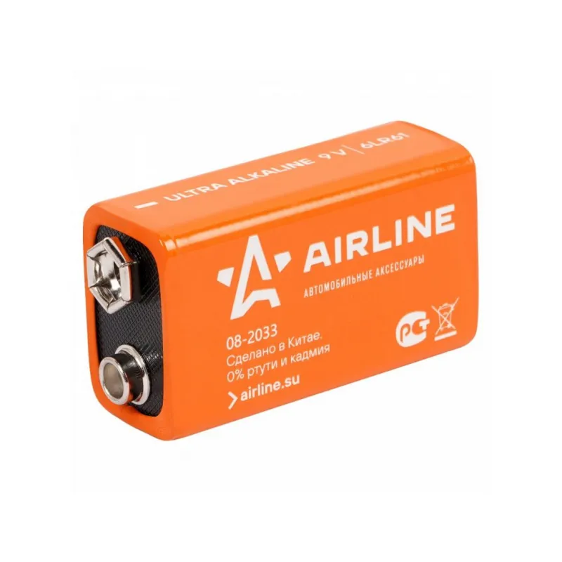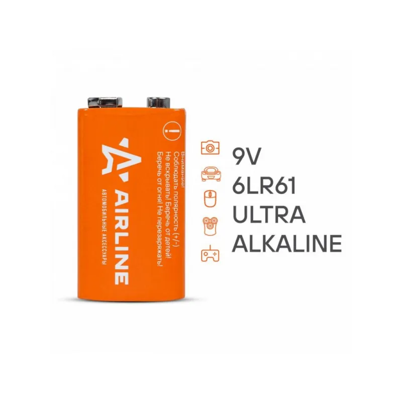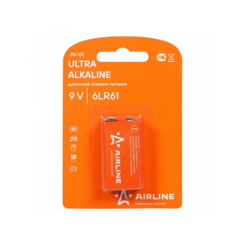 Батарейка 6LR61/Крона 9V щелочная 1 шт. Описание: Батарейки крона 9V / 6LR61 щелочные 1 шт 9 В AIRLINE 9V-01 - Ultra Alkaline, (алкалиновые) щелочной элемент питания. Долговечные батарейки – идеальный источник питания для часто используемых устройств. Эти надежные батарейки гарантируют, что ваши гаджеты будут работать дольше, обеспечивая стабильную и продолжительную работу. Оптимальное решение для тех, кто ценит качество и долговечность. Особенности и преимущества: *Удобная и экономичная упаковка - оптимальное количество для подзарядки устройств. *Высокая емкость батареек 6LR61, продолжительный срок службы, низкий уровень саморазряда. *Электрическая емкость выше, чем у солевой батарейки. *Абсолютная герметичность. *Увеличенный срок службы. При установке соблюдать полярность (+/-). Не устанавливать одновременно заряженные и разряженные элементы, а также элементы различных марок, систем и типов. Батарейки подойдут на устройства: телевизионные пульты, ручные фонарики, игрушки, часы, детские игрушки, джойстики, компьютерные мышки, фотоаппараты, плееры. Товар официального производителя AIRLINE. Батарейки это нужная вещь в хозяйстве, всегда пригодится. Характеристики: Артикул: 9V-01 Номинальное напряжение, В: 9 Типоразмер: 6LR61 Комплектация: Батарейка в блистере - 1 шт Гарантия: от 1 года.
