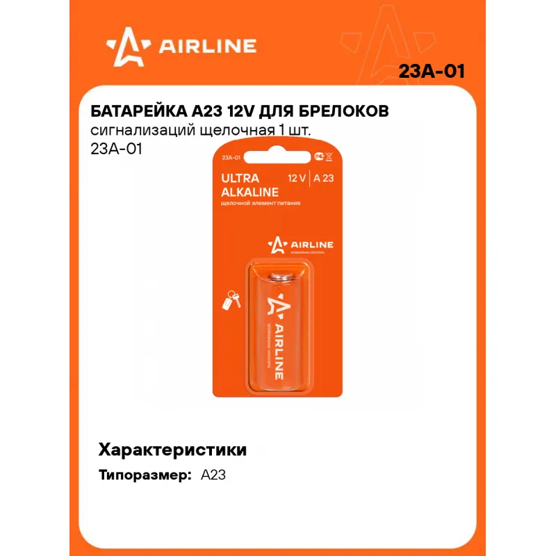 Батарейка A23 12V для брелоков сигнализаций щелочная 1 шт. Описание: Батарейки A23 / 12V щелочные 1 шт для брелоков сигнализаций AIRLINE 23A-01 - Ultra Alkaline, (алкалиновые) щелочной элемент питания. Долговечные батарейки – идеальный источник питания для часто используемых устройств. Эти надежные батарейки гарантируют, что ваши гаджеты будут работать дольше, обеспечивая стабильную и продолжительную работу. Оптимальное решение для тех, кто ценит качество и долговечность. Особенности и преимущества: *Удобная и экономичная упаковка - оптимальное количество для подзарядки устройств. *Высокая емкость батареек A23, продолжительный срок службы, низкий уровень саморазряда. *Электрическая емкость выше, чем у солевой батарейки. *Абсолютная герметичность. *Увеличенный срок службы. При установке соблюдать полярность (+/-). Не устанавливать одновременно заряженные и разряженные элементы, а также элементы различных марок, систем и типов. Батарейки подойдут на устройства: телевизионные пульты, ручные фонарики, игрушки, часы, детские игрушки, джойстики, компьютерные мышки, фотоаппараты, плееры. Товар официального производителя AIRLINE. Батарейки это нужная вещь в хозяйстве, всегда пригодится. Характеристики: Артикул: 23A-01 Типоразмер: A23 Комплектация: Батарейка в блистере - 1 шт Гарантия: от 1 года.