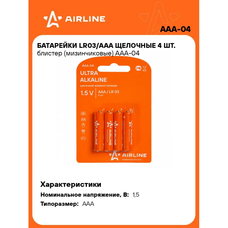 Батарейки мизинчиковые AAA / LR03 щелочные 4 шт 1,5 В AIRLINE AAA-04