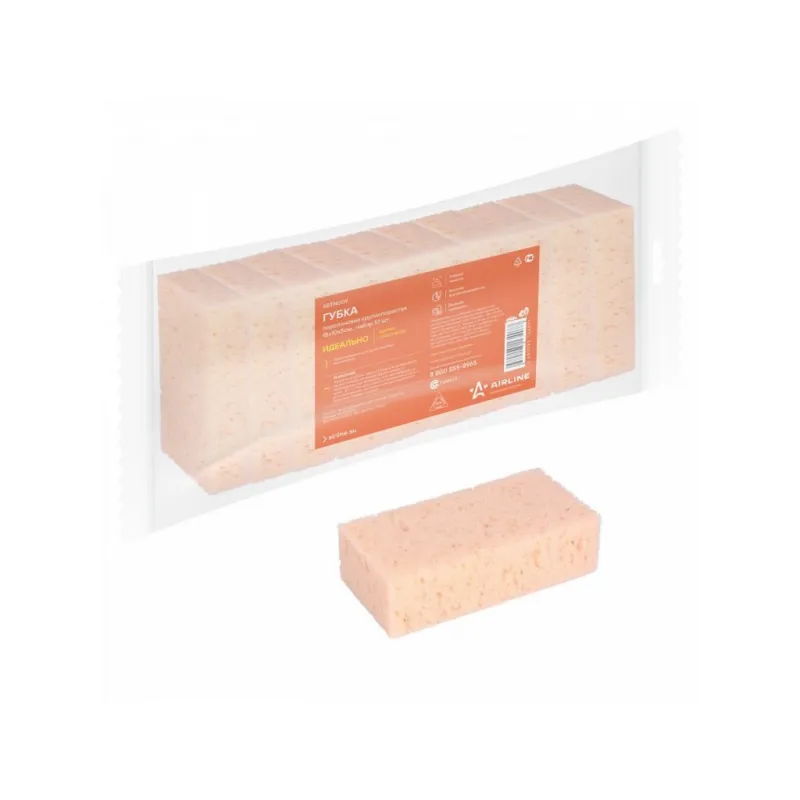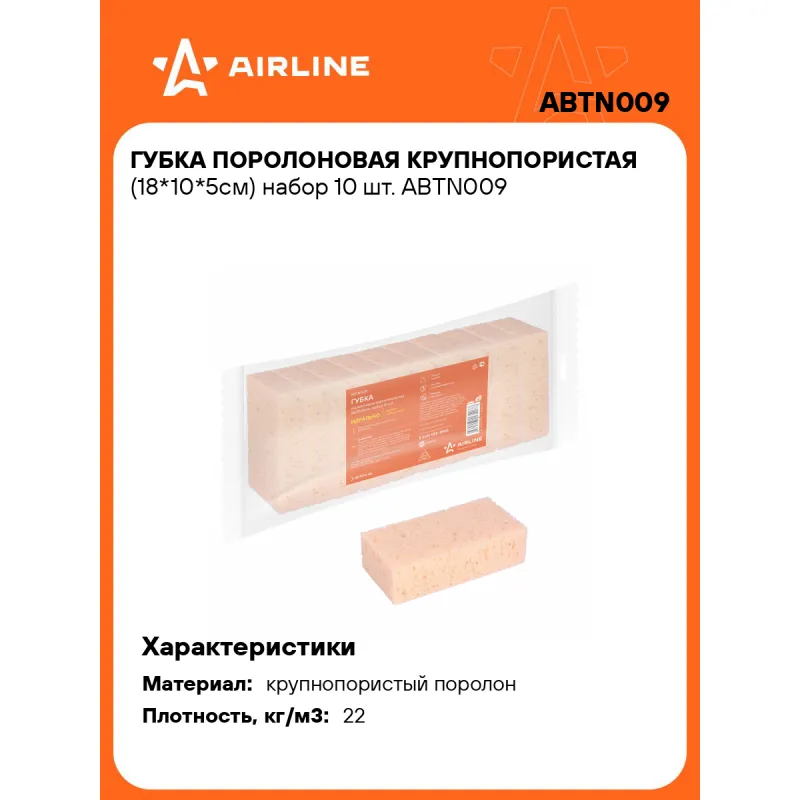 Губка поролоновая крупнопористая (18*10*5см) набор 10 шт. Описание: Губка поролоновая крупнопористая AIRLINE предназначена для ручной мойки автомобиля. Обладает повышенной прочностью, высокой влаговпитываемостью, хорошо пенится. Характеристики: Артикул: ABTN009 Длина, см: 18 Ширина, см: 10 Высота, см: 5 Материал: крупнопористый поролон Плотность, кг/м3: 22 Комплектация: Губка - 10 шт Пакет - 1 шт Гарантия: от 1 года.