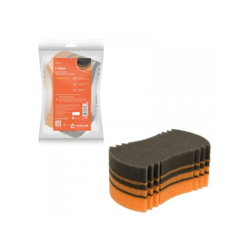 Губка поролоновая "Восьмерка гранд" (20,5*11,5*7см) (пакет с европодвесом) Описание: Губка поролоновая "Восьмерка гранд" AIRLINE, изготовленная из ВЫСОКОПРОЧНОГО мелкопористого поролона, поможет очистить фары, стекла и кузов машины от разводов, грязи и пыли. Увеличенный размер губки позволяет впитывать большее количество жидкости или моющего средства, что дает возможность еще тщательнее очищать загрязненную поверхность. Пористое строение губки не дает собраться мелкому мусору, поэтому моющий слой изделия всегда остается гладким и не царапает поверхность. Характеристики: Артикул: AB-T-03 Длина, см: 20,5 Ширина, см: 11,5 Высота, см: 7 Материал: мелкопористый поролон Плотность, кг/м3: 18 Комплектация: Губка поролоновая - 1 шт Бумажная вкладка - 1 шт Пакет с европодвесом - 1 шт Гарантия: от 1 года.