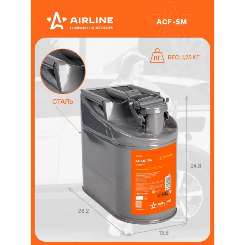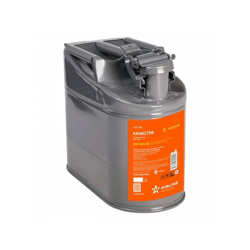 Канистра 5л металлическая Описание: Металлическая канистра ACF-5M бренда AIRLINE объемом 5 л - автомобильный аксессуар, который можно использовать для транспортировки и хранения бензина, дизеля или масла, в качестве основного или дополнительного топливного бака. Она оснащена крышкой с рычажным затвором, который удерживает крышку от самопроизвольного открытия. Горловина канистры оснащена воздушным каналом для быстрой и удобной заправки автомобиля. Удобный органайзер с ручкой подойдет для хранения любых горючесмазочных: бензинового или дизельного топлива. Также канистра подходит для разных жидкостей: тормозной, антифриз (тосол), простой и дистиллированной воды. Металлическая канистра будет удобна в качестве дорожной, домашней, экспедиционной, туристической водной тары для похода, поездки, дальней дороги. Займет немного места в багажнике или салоне вашей машинки, в хозяйственном помещении или на даче. Удобное хранение ГСМ и любых жидкостей, необходимых для эксплуатации не только машины любой марки, но и мотоцикла, квадроцикла, снегохода, снегоуборщика, мотоблока, газонокосилки, бензопилы, лодки или катера. Канистра - автомобильный аксессуар в авто будет отличным подарком для автомобилиста - мужа или папы, брата или любимого человека, парня или девушки, мужчины или женщины, вне зависимости от того, какую машину они водят - Volvo, Mercedes, BMW, Жигули, Ладу, Зил или Камаз. Автотовар поставляется в защитной упаковке для сохранности. Прямые поставки с завода - производителя. Сертифицировано в соответствии с законом о пожарной безопасности. Не накапливает статический заряд. Товар официального производителя AIRLINE. Характеристики: Артикул: ACF-5M Материал: сталь Объем, л: 5 Тип крышки: с рычажным затвором Толщина стенок, мм: 0,6 Комплектация: Канистра с наклейкой - 1 шт Гарантия: от 1 года.