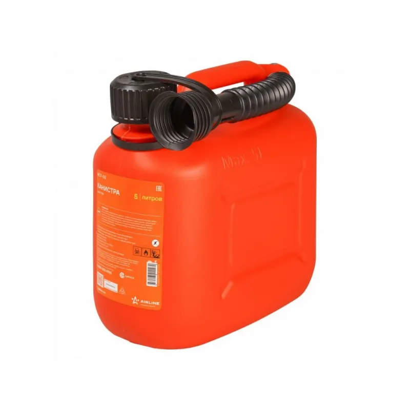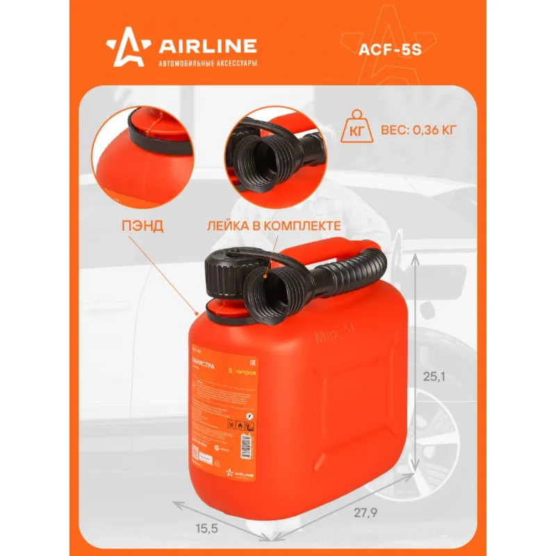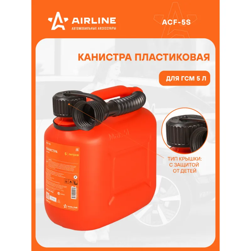 Канистра 5л пластиковая, крышка с защитой от детей Описание: Пластиковая канистра ACF-5S бренда AIRLINE объемом 5 л - автомобильный аксессуар, который можно использовать для транспортировки и хранения бензина, дизеля или масла, в качестве основного или дополнительного топливного бака. Она оснащена крышкой с клапаном - заглушкой (без прокладки) с защитой от открытия детьми, а также заливной лейкой с гибким гофрированным носиком. Гофрированный носик оснащен воздушным каналом для быстрой и удобной, совершенно чистой заправки бензобака автомобиля, замены и заливки масла без брызг в процессе заправочных работ. Универсальная модель изготовлена из первичного пластика (ПЭНД), плотного и легкого, с антистатическими свойствами, согласно обязательным требованиям пожарной безопасности при использовании канистр для ГСМ. Узкий носик глубоко входит внутрь горловины канистры для исключения потери и протекания жидкости, а также для минимизации запаха от испарения ГСМ. Канистра подходит для разных жидкостей: тормозной, антифриз (тосол), простой и дистиллированной воды. Пластиковая канистра станет альтернативой плоским металлическим емкостям или стеклянным бутылям. Займет немного места в багажнике или салоне вашей машины. Хранение ГСМ и любых жидкостей, необходимых для эксплуатации не только машины любой марки, но и мотоцикла, квадроцикла, снегохода, снегоуборщика, мотоблока, газонокосилки, бензопилы, лодки или катера. Пластиковая канистра - отличный подарок для автомобилиста - мужа или папы, брата или любимого человека, парня или девушки, мужчины или женщины, вне зависимости от того, какую машину они водят - Volvo, Mercedes, BMW, Жигули, Ладу, Зил или Камаз. Товар официального производителя AIRLINE. В нашем магазине, вы найдете широкий ассортимент высококачественных автотоваров, автозапчастей, аксессуары для мотоцикла, ремонтные комплекты, аксессуары для машины, электрооборудование, пластиковые, металлические, алюминиевые канистры и многое другое. Характеристики: Артикул: ACF-5S Внутренний диаметр горловины, мм: 34 Объем, л: 5 Материал: ПЭНД Тип крышки: винтовая с защитой от детей Толщина стенок, мм: 1,3 Комплектация: Канистра с наклейкой, крышкой с защитой от детей и лейкой - 1 шт Гарантия: от 1 года.