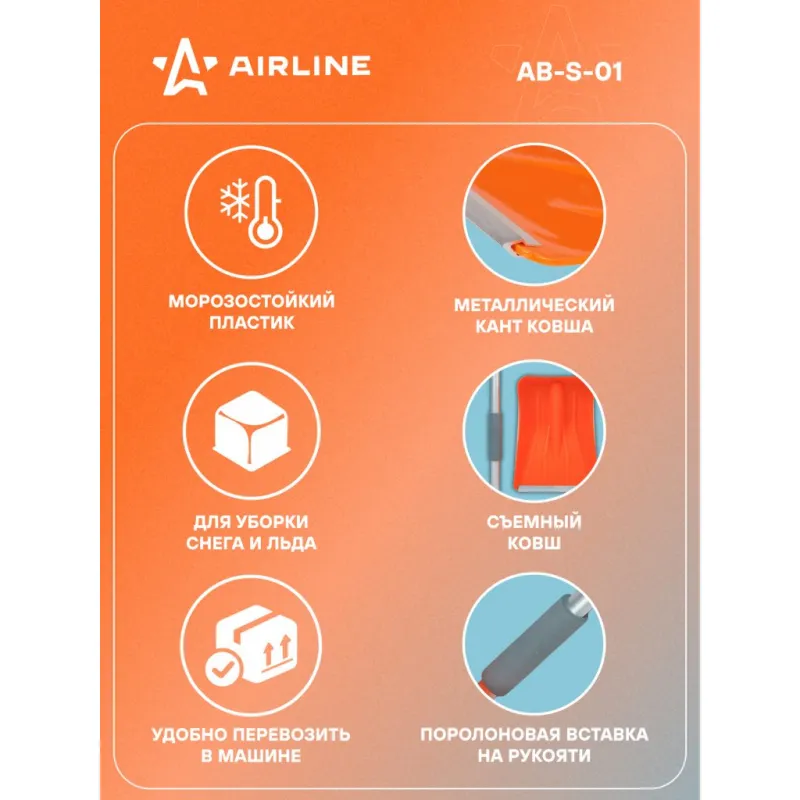 Лопата для очистки снега c телескоп.рукояткой и металл.кантом (86-110*24 см) Описание: Лопата c телескопической рукояткой и металлическим кантом (86-110*24 см) от бренда AIRLINE - выполнена из морозостойкого пластика и металла. Лопата является идеальной для уборки снега и перевозки в автомобиле. Телескопическая рукоятка лопаты позволяет перевозить изделие в багажнике любого авто (MIN длина = 86 см). Ковш изделия изготовлен из особого морозостойкого пластика, который значительно уменьшает вес изделия, облегчая работу при уборке снега. Кант лопаты имеет алюминиевую вставку - для работы с легкой наледью. Поролоновая вставка на ручке делает уборку снега максимально удобной. Автомобильная лопата для снега необходимый инвентарь в борьбе со снегом и позволит быстро и эффективно очистить территорию от осадков. С помощью этой лопаты, вы сможете легко и быстро очистить свой автомобиль от снега и льда. Особенности: - Высокая износостойкость; - Удобный прихват; - Эргономичная конструкция; - Ударопрочная; - Прочность и долговечность. Идеальный аксессуар для вашей машины, который обеспечит надежную и эффективную уборку снега в зимний период. Лопата для снега в машину изготовлена из прочных материалов, имеет эргономичную ручку, которая обеспечивает удобное и комфортное использование, даже в течение продолжительного времени. Компактный размер позволяет хранить эту лопату в машине и всегда иметь ее под рукой, когда вам понадобится. Лопата автомобильная идеальный аксессуар в машину и подойдет в качестве подарка мужу, дедушке, мужчине, автомобилисту, на день рождения, новый год, 23 февраля и без повода. Характеристики: Артикул: AB-S-01 Длина в разложенном виде, см: 112 Длина в сложенном виде, см: 86 Длина ковша, см: 35 Ширина ковша, см: 24 Комплектация: Лопата для очистки от снега телескопическая (86-112*24 см) с лейблом - 1 шт Гарантия: от 1 года.