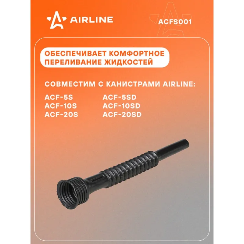 Носик гофрированный для пластиковых канистр с резьбовой крышкой Описание: Носик для пластиковых канистр с резьбовой крышкой ACFS001 от бренда AIRLINE обеспечивает комфортное переливание любых жидкостей. Особенности носика для пластиковых канистр: - Пластик устойчив к агрессивным средам; - Подходит для масла, бензина, топлива; - Применяется с канистрами AIRLINE для бензина: ACF-5S, ACF-10S, ACF-20S. А также с канистрами AIRLINE для дизельного топлива: ACF-5SD, ACF-10SD, ACF-20SD. Товар официального производителя AIRLINE. Отличное приобретение на подарок мужчине, женщине, автомобилисту, папе, отцу, мужу, парню и другу на Новый год, день рождения и без повода, незаменимая вещь для дома, автосервиса, для профессионального использования. Характеристики: Артикул: ACFS001 Материал: ПНД Тип крышки: винтовая Комплектация: Носик гофрированный - 1 шт Гарантия: от 1 года.