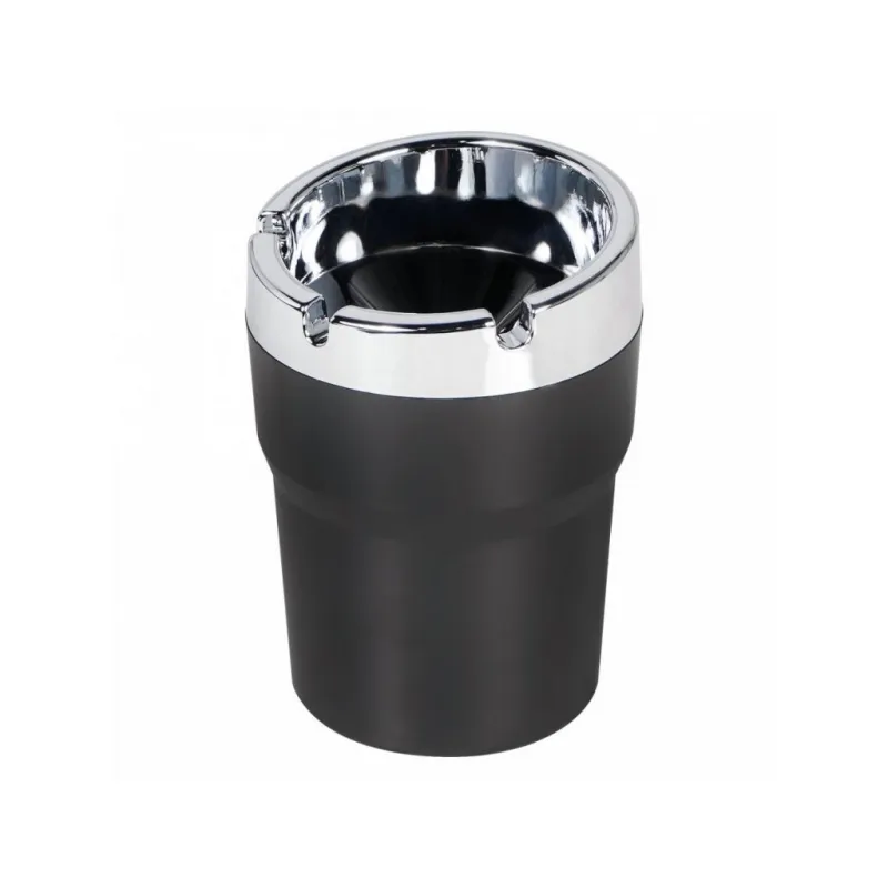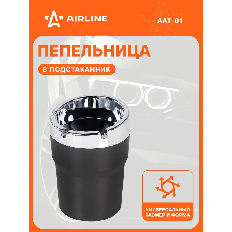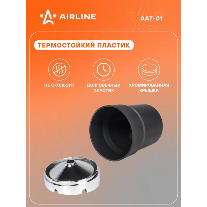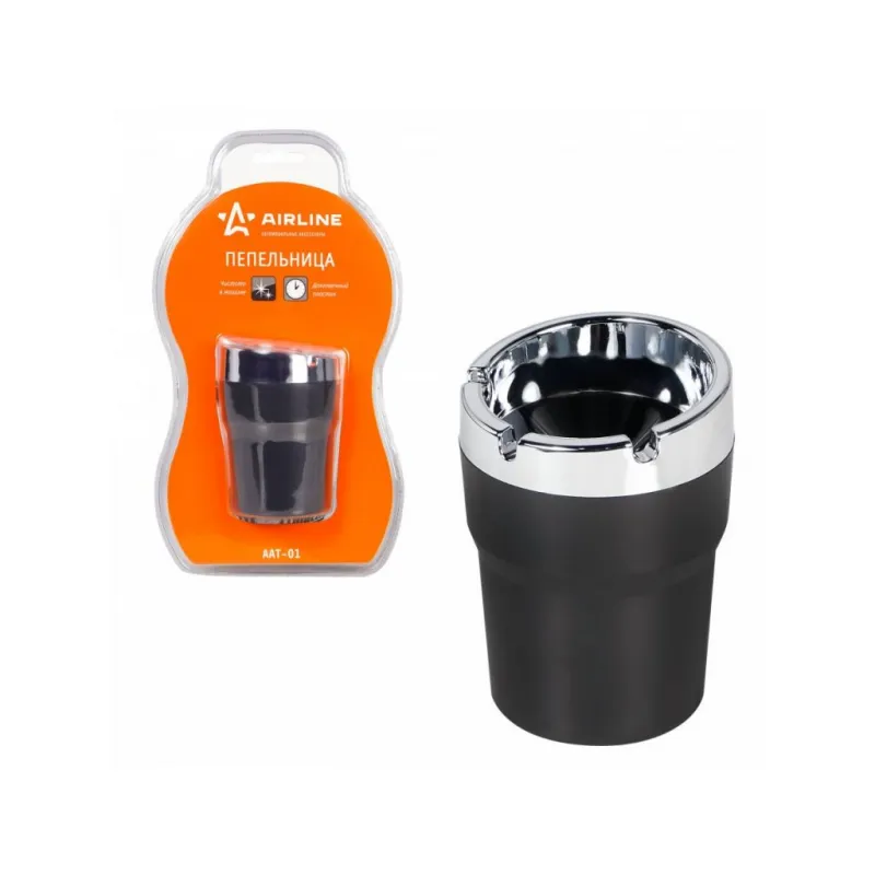 Пепельница классическая, круглая, цвет черный/хром Описание: Пепельница данной модели от AIRLINE имеет универсальный размер и форму в виде компактного стакана с закрытой крышкой. Пепельница изготовлена из особо стойкого пластика. Для предотвращения возгорания крышка пепельница обработана специально разработанным покрытием, которое обладает термостойкими показателями и не воспламеняется. Пепельница изготовлена в черном цвете с серебряной окантовкой по верхней части изделия. Характеристики: Артикул: AAT-01 Высота, мм: 80 Тип Батарейки: нет Диаметр верхний, мм: 75 Цвет: черный/хром Диаметр нижний, мм: 67 Термостойкий пластик: да Комплектация: Пепельница в блистерной упаковке - 1 шт Гарантия: от 1 года.