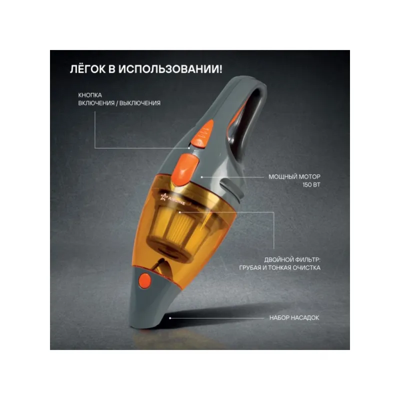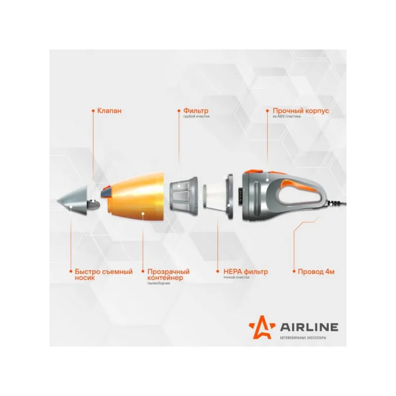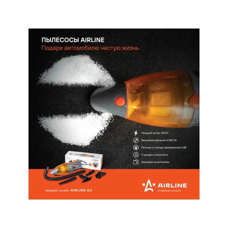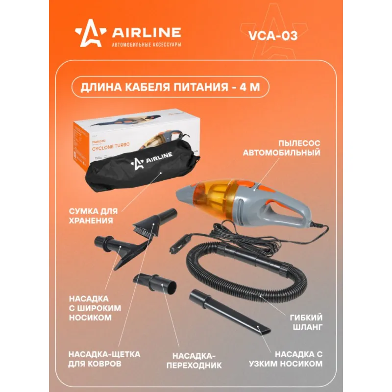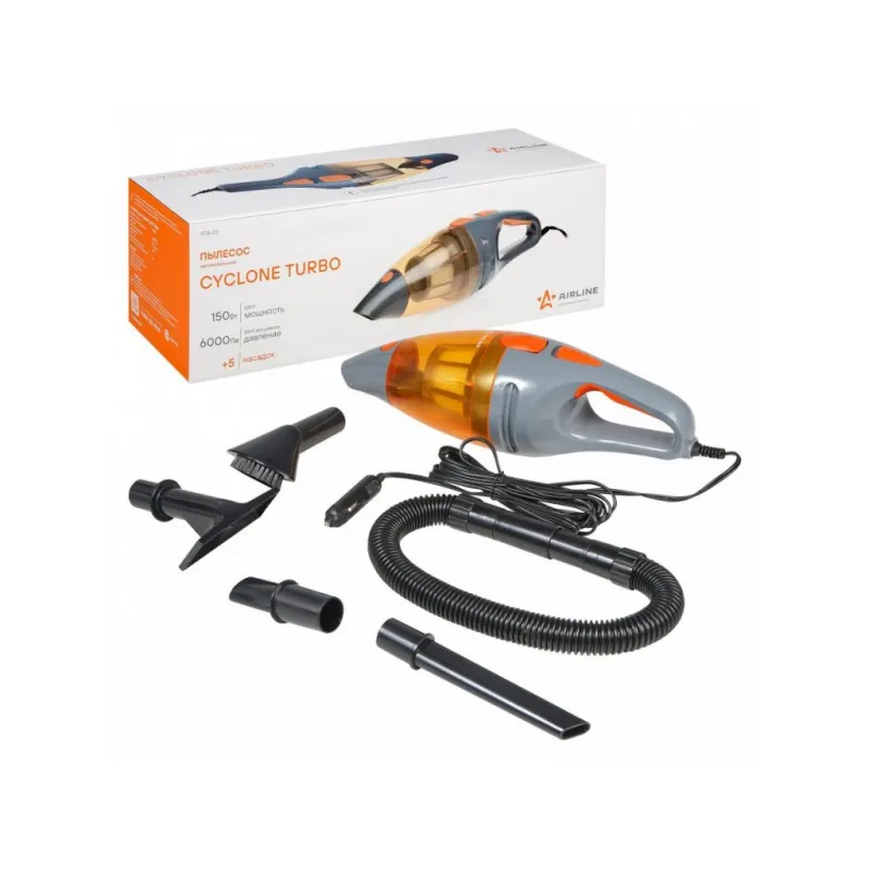 Пылесос CYCLONE TURBO 6000PA в сумке (150Вт, 0,5л) Описание: Пылесос для автомобиля CYCLONE TURBO мощный 150 Вт VCA-03 от бренда AIRLINE изготовлен из морозостойких материалов и работает от бортовой сети (от прикуривателя) с напряжением 12 Вольт. Ручной пылесос автомобильный подходит для сухой уборки в машине, в гараже, для автомобильных ковриков, приборной панели и любых конструктивных деталей, для мебели, матраса, кровати, поверхности дивана или кресла, удобен для уборки труднодоступных мест. Пылесборник для сбора мусора - контейнер с клапаном объемом 0.5 литра и дополнительный сменный пылевой HEPA фильтр, который задерживают в пылесборнике даже мельчайшую пыль размером до 0,3 микрон. Набор для автомобиля подарочный для ухода за салоном машины - универсальный подарочный вариант для автомобилиста. Набор для машины подарочный удобен в эксплуатации благодаря компактному размеру, а в комплекте есть сумка для хранения пылесоса и комплектующих. Аксессуар в машину в подарок мужчине, папе или мужу, лучшему другу. Характеристики: Артикул: VCA-03 Мощность, Вт: 150 Максимальный ток, А: 12 Длина кабеля питания, м: 4 Максимальное вакуумное давление, Па: 6000 Напряжение питания, В: 12 Объем пылесборника, мл: 500 Тип фильтра: HEPA фильтр (задерживает частицы до 0,3 мк) Сменный фильтр: AVCF002 Комплектация: Пылесос автомобильный - 1 шт Насадка с узким носиком - 1 шт Насадка с широким носиком - 1 шт Насадка-щетка для ковров 360° - 1 шт Гибкий шланг - 1 шт Насадка-переходник - 1 шт Сумка для хранения - 1 шт Паспорт изделия - 1 шт Гарантийный талон - 1 шт Упаковочная коробка - 1 шт Гарантия: от 1 года.