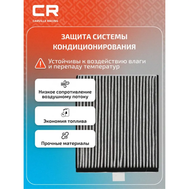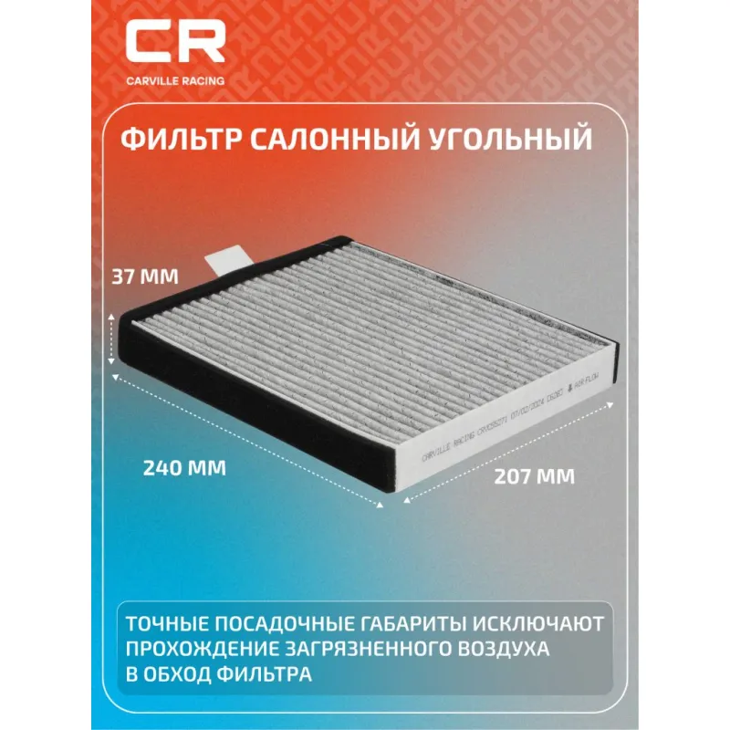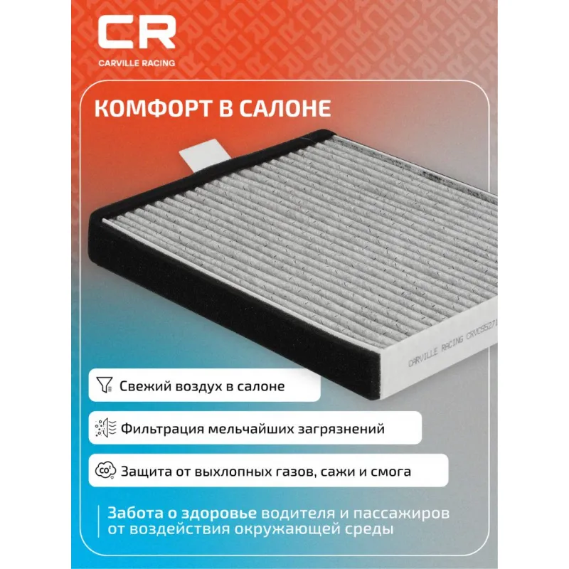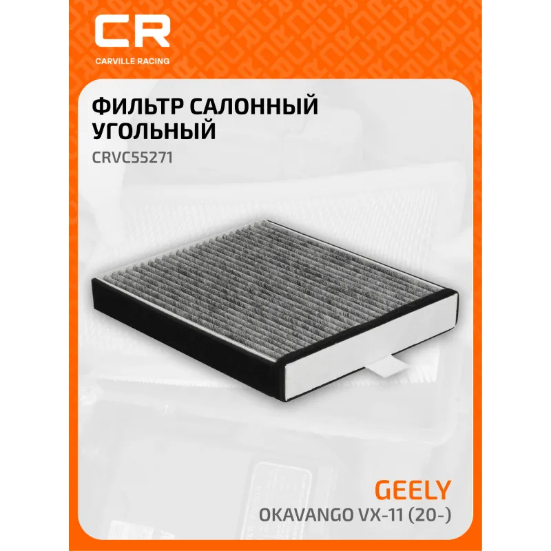 Фильтр салонный угольный для автомобилей Geely Okavango VX-11 (20-) Описание: Салонные фильтры CRVC55271 бренда CARVILLE RACING обеспечивают подачу очищенного воздуха в салон автомобиля, эффективно защищают водителя и пассажиров от воздействия пыли, сажи, смога, пыльцы и других дорожных загрязнений. Угольные фильтры обеспечивают лучшую фильтрацию выхлопных газов и неприятных запахов. Подбор по VIN-номеру вашего автомобиля - через кнопку 'Задать вопрос'. Специалист проверит применяемость и ответит вам. Применяемость GEELY OKAVANGO.. Производство фильтров осуществляется на высокотехнологичных автоматизированных линиях, сертифицированных стандартом IATF 16949:2016. Вся продукция испытывается в испытательных лабораториях, аккредитованных стандартами по ISO 17025: 2017 и CNAS-CL01. Большое количество складок и большая площадь фильтрации обеспечивают фильтрацию мельчайших загрязнений и большую грязеемкость для длительного срока службы. Устойчивы к воздействию влаги и перепаду температур, предотвращают запотевание окон. Точные посадочные габариты исключают прохождение воздуха в обход фильтра. Характеристики: Артикул: CRVC55271 OEM номера: 8025530400 Ширина, мм: 207 Длина, мм: 240 Высота, мм: 37 Исполнение фильтра: Угольный Количество на автомобиль: 1 Подходит для авто: Geely Okavango (20-) Для проверки применяемости отправьте VIN автомобиля через вкладку "Есть вопросы о товаре?" Комплектация: Фильтр салонный угольный - 1 шт Гарантия: от 1 года.