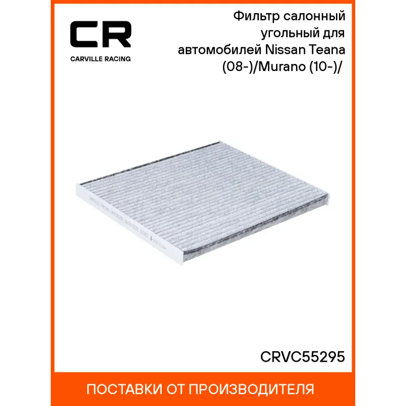 Фильтр салонный угольный для автомобилей Nissan Teana (08-)/Murano (10-)/(16-) Характеристики: Артикул: CRVC55295 OEM номера: 272772FT1A Ширина, мм: 244 Длина, мм: 280 Высота, мм: 20 Исполнение фильтра: Угольный Количество на автомобиль: 1 Комплектация: Фильтр салонный угольный - 1 шт Гарантия: от 1 года.