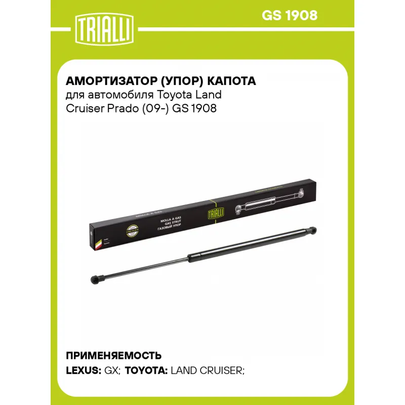Амортизатор (упор) капота для автомобиля Toyota Land Cruiser Prado (09-) Характеристики: Артикул: GS 1908 OEM номера: 534500W180, 534400W220 Товарная линейка: BLACK Количество на автомобиль: 2 Гарантийный срок: 2 года / 60 000 км Длина в свободном состоянии: 528 Длина в сжатом состоянии: 338 Ход поршня: 190 Усилие в точке P3: 260 Комплектация: Амортизатор (упор) капота - 1 шт Гарантия: от 1 года.