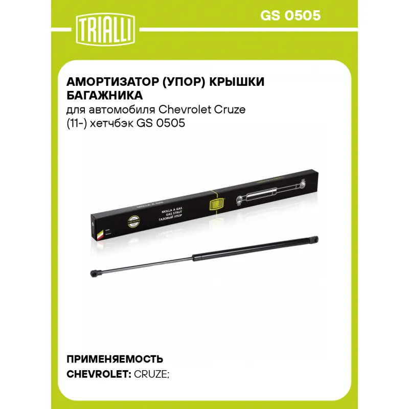 Амортизатор (упор) крышки багажника для автомобиля Chevrolet Cruze (11-) хетчбэк Характеристики: Артикул: GS 0505 OEM номера: 95472696 Товарная линейка: BLACK Количество на автомобиль: 2 Гарантийный срок: 2 года / 60 000 км Длина в свободном состоянии: 607 Длина в сжатом состоянии: 371 Ход поршня: 236 Усилие в точке P3: 325 Комплектация: Амортизатор (упор) крышки багажника - 1 шт Гарантия: от 1 года.