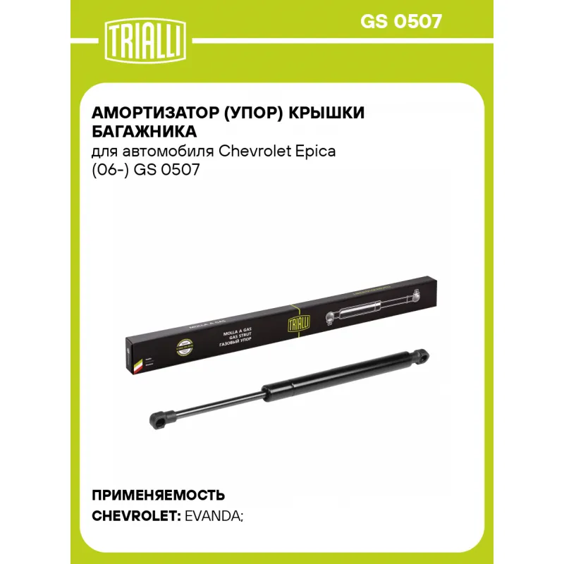 Амортизатор (упор) крышки багажника для автомобиля Chevrolet Epica (06-) Характеристики: Артикул: GS 0507 OEM номера: 96474968, 96636412, 96636674 Товарная линейка: BLACK Количество на автомобиль: 2 Гарантийный срок: 2 года / 60 000 км Длина в свободном состоянии: 334 Длина в сжатом состоянии: 229 Ход поршня: 105 Усилие в точке P3: 400 Комплектация: Амортизатор (упор) крышки багажника - 1 шт Гарантия: от 1 года.