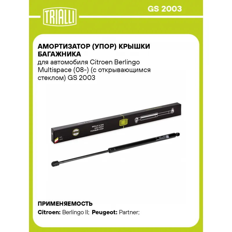 Амортизатор (упор) крышки багажника для автомобиля Citroen Berlingo Multispace (08-) (с открывающимся стеклом) Характеристики: Артикул: GS 2003 OEM номера: 8731S0, 7000510366, 9819027880 Товарная линейка: BLACK Количество на автомобиль: 2 Гарантийный срок: 2 года / 60 000 км Длина в свободном состоянии: 620 Длина в сжатом состоянии: 396 Ход поршня: 224 Усилие в точке P3: 625 Подходит для авто: Citroen Berlingo II (08-) Peugeot Partner (08-), Partner (08-) Для проверки применяемости отправьте VIN автомобиля через вкладку "Есть вопросы о товаре?" Комплектация: Амортизатор (упор) крышки багажника - 1 шт Гарантия: от 1 года.