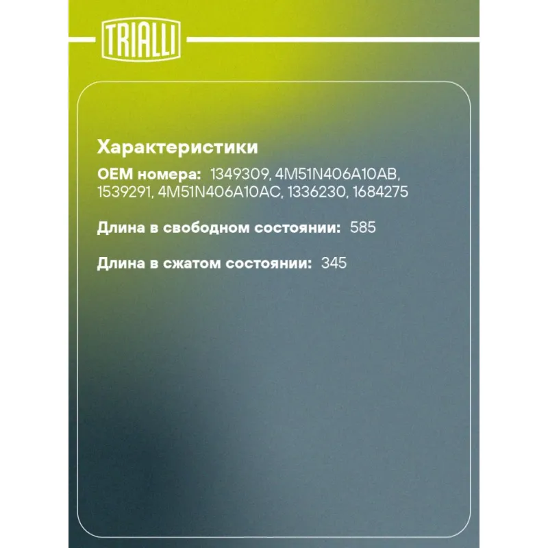 Амортизатор (упор) крышки багажника для автомобиля Ford Focus II (05-) универсал Характеристики: Артикул: GS 1007 OEM номера: 1349309, 4M51N406A10AB, 1539291, 4M51N406A10AC, 1336230, 1684275 Товарная линейка: BLACK Количество на автомобиль: 2 Гарантийный срок: 2 года / 60 000 км Длина в свободном состоянии: 585 Длина в сжатом состоянии: 345 Ход поршня: 240 Усилие в точке P3: 420 Подходит для авто: Ford Focus II (05-), Focus II (05-) Для проверки применяемости отправьте VIN автомобиля через вкладку "Есть вопросы о товаре?" Комплектация: Амортизатор (упор) крышки багажника - 1 шт Гарантия: от 1 года.